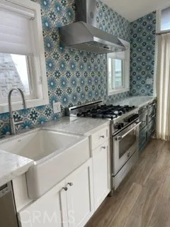 Some of the items included : kitchen with high end appliances, counter tops , cabinetry , lighting, , flooring and fixtures. Throughout the home all hardware including doors, window covers, lighting, bath and appliances were personally handpicked by the Owner. This is a Single Family residence on a 1/2 lot. Conveniently located just blocks from the epicenter of the Manhattan Beach community. Entry level has a large double car garage with access to the home, and a huge room with full bath that could be a living room, media, and lounging area. Upstairs are three bedrooms and 2 baths and a giant living room adjacent to the kitchen all under high beamed vaulted ceilings. The interior walls are Venetian Plaster. Double sliding doors with a clear story window lookout to the peak-a-boo ocean view just down the street.