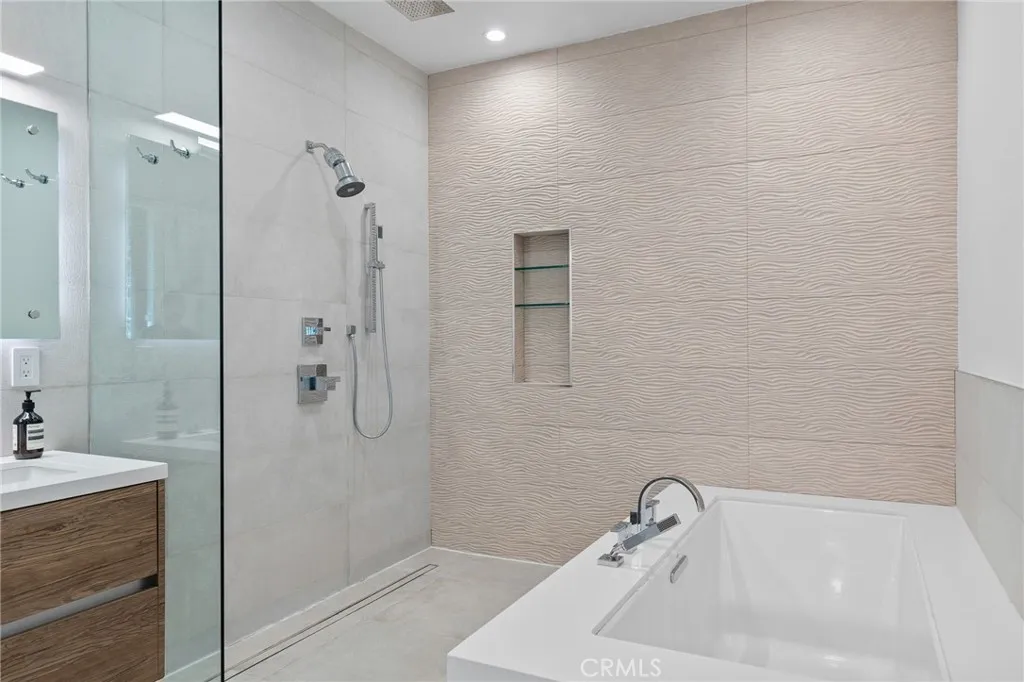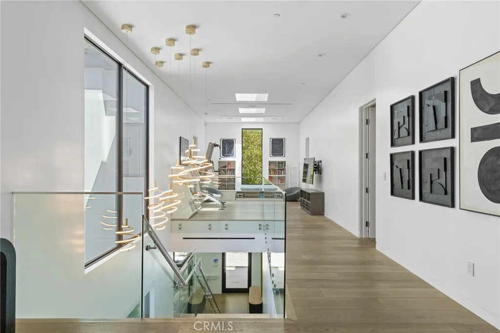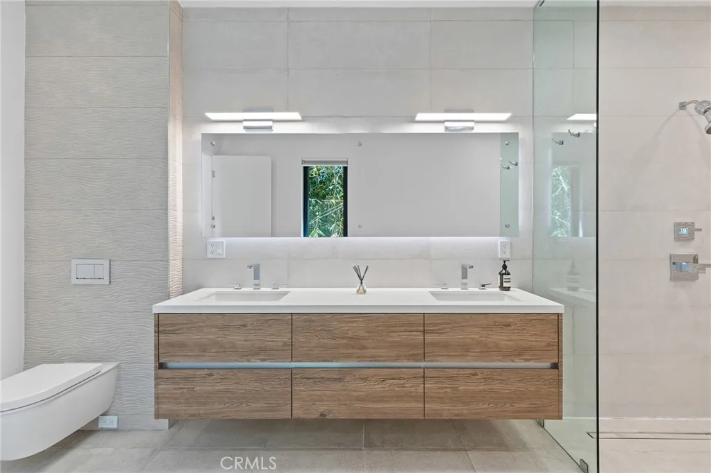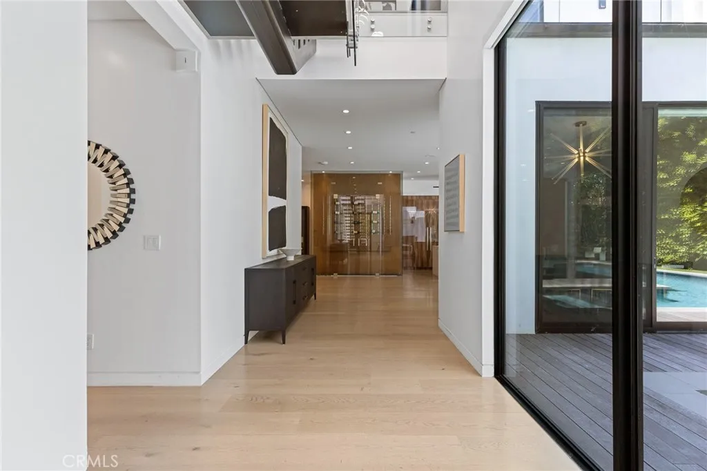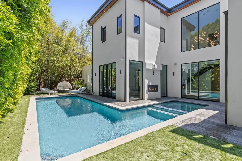 Gated and set behind a long private driveway, this custom contemporary estate offers exceptional privacy and refined modern living on one of the most desirable streets south of Ventura Boulevard. Surrounded by mature bamboo and ficus trees, the home provides a serene, resort-like setting just moments from Sherman Oaks best shopping and dining. Soaring ceilings and walls of glass fill the interiors with natural light, seamlessly connecting the open-concept living, dining, and chefs kitchen. The kitchen features premium Bosch and Viking appliances, custom cabinetry, a walk-in pantry, and a striking Calacatta marble island, complemented by a sleek glass-enclosed wine display and double-sided fireplace. Expansive sliding doors open to an entertainers backyard with a dramatic negative-edge pool, spa, and built-in BBQ, ideal for indoor-outdoor living. The main level includes a private bedroom suite perfect for guests or an office. Upstairs offers a family lounge, four en-suite bedrooms with walk-in closets, a spacious primary suite with fireplace and spa-style bath, and an upstairs laundry room. Built in 2018 with parking for 10+ cars, and just a short walk to Whole Foods, restaurants, the Sherman Oaks Galleria, and minutes to Buckley and Campbell Hall.