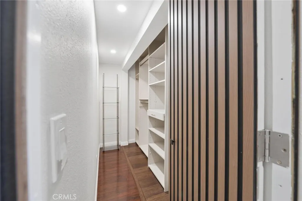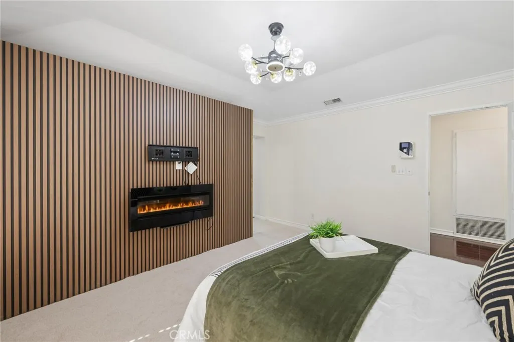 Upgraded interior, perfectly positioned at the end of a quiet cul-de-sac with only one neighbor next to you and none behind, a Tesla 240V charger, and the added luxury of 2 private balconies and a large patio. Step inside this desirable end-unit wrapped in new shell white designer paint, where soaring 18-foot vaulted ceilings, expansive windows & large skylights flood the home with natural light highlighting the brand-new exquisite laminate wood flooring, extending through the living area, kitchen, dining area, laundry space, and 1/2 bath, accompanied by refreshed crown molding & baseboards. A black metal-frame fireplace with glass doors accented by brass trim and a wood mantel adds a modern touch to the living space. Double French doors open to the large patio perfect for hosting gatherings, creating a BBQ area, or an outdoor lounge. Arched entryways lead you to the dining area and kitchen with recessed lighting, stainless-steel appliances, a dedicated laundry area and a 1/2 bath with direct access to the 2 car garage. Upstairs, the primary suite awaits with brand new light bisque carpet, a contemporary chandelier with sculptural glass globes, an electric fireplace set against a wood slat accent wall that conceals a hidden walk-in closet, and double French doors that open to your private balcony. The luxury spa-like bathroom showcases large-format tile flooring with subtle marble veining spread throughout the space. An enclosed shower with frameless tempered glass, brushed brass hardware, elegant marble-inspired wall panels, a rainfall showerhead paired with a handheld fix