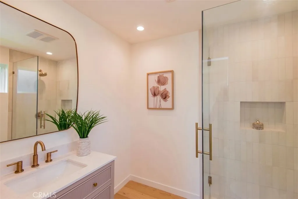 Welcome to 158 S Formosa Avenue, a rare reimagined traditional home nestled within a tranquil tree-lined street in the highly desirable Miracle Mile North Historic Preservation neighborhood. A Beautiful exterior color palette and succulent landscaping greet you upon arrival. Step inside and be captivated by the warm attention to detail, restoration, and creation of era style elements. The thoughtfully designed open-concept floor plan features a large gourmet kitchen perfect for culinary enthusiasts, complete with top-of-the-line custom matching appliances, quartz counters, white oak cabinetry, large Apron sinks, floating shelves and designer light fixtures. All overlooking the tranquil dining area. Your beautiful re-inspired living room features a stand out quartz fire place, custom crown molding, a historic timeless front bow window with leaded glass and French oak floors throughout. Parallel to the living room is your first bedroom, this could be converted very simply by the contractor into a den or your own private dining area if preferred. The large primary bedroom & bathroom features a double reeded vanity, standalone tub, walk in glass shower, large format designer tile, walk in closet, separate smaller closet and French doors leading out to a large wrap around deck. The other 3 bedrooms have ample space, closets and one of the bedrooms has french doors also leading out to the deck. The other two bathrooms have a mixture of marble vanities. Delta shower finishes, herringbone porcelain floors and brass hardware. The ADU has its own kitchenette, bathroom with walk in sh