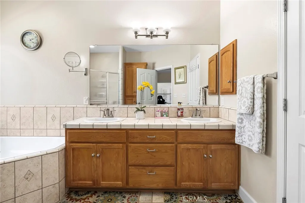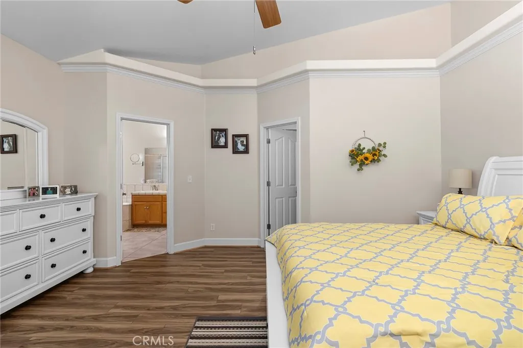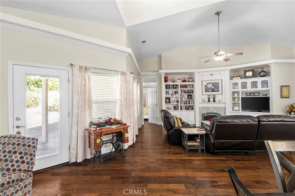 This beautiful home welcomes you with a marvelous open floor plan and soaring vaulted ceilings that make the living space feel bright, airy, and expansive. Natural light pours in, highlighting the high-end laminate wood flooring throughout the main living areas, while two bedrooms offer soft carpet for comfort and the primary suite offering updated flooring. The spacious living room features a cozy gas fireplace with a stunning built-in bookshelf, creating the perfect space to relax or gather. The kitchen is thoughtfully designed for both everyday living and entertaining, complete with granite countertops, tile backsplash, stainless steel appliances, a large pantry, two ovens for the bakers, and an eat-up bar for casual dining. The master suite is privately located on the opposite side of the home, offering a peaceful retreat. It features a spacious walk-in closet and a beautifully appointed bathroom with dual sinks, a soaking tub, and a walk-in shower with dual shower heads and updated fixtures. Both guest bedrooms are generously sized with high ceilings, and the hall bathroom includes a large vanity with double sinks and updated finishes. Step outside to a backyard designed for enjoyment, featuring a covered patio perfect for evening entertaining, raised garden beds, and mature fig and orange trees. The front of the home offers a large composite deck, ideal for sipping your morning coffee in a quiet, peaceful setting. Additional highlights include a spacious laundry room with ample storage and counter space, ceiling fans throughout, an oversized two-car garage, and a full