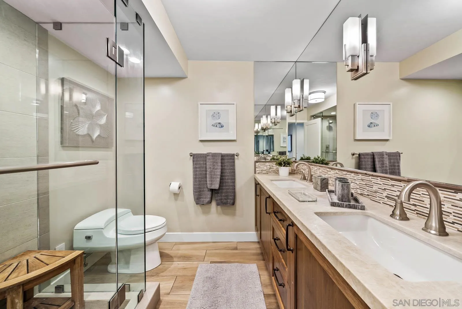 Experience luxury coastal living in one of the largest two-bedroom floor plan at The Shores. This beautifully remodeled unit designed by Michael Roy features new windows, automatic blinds, sleek ceramic tile flooring, a stunning "Taj Mahal" quartzite countertop and all high-end appliances. Thoughtfully designed with custom walk-in closets and premium finishes throughout. The unit is being offered furnished, making your move a breeze. A rare opportunity to own in La Perla tower, one of Coronado Shores most desirable buildings.