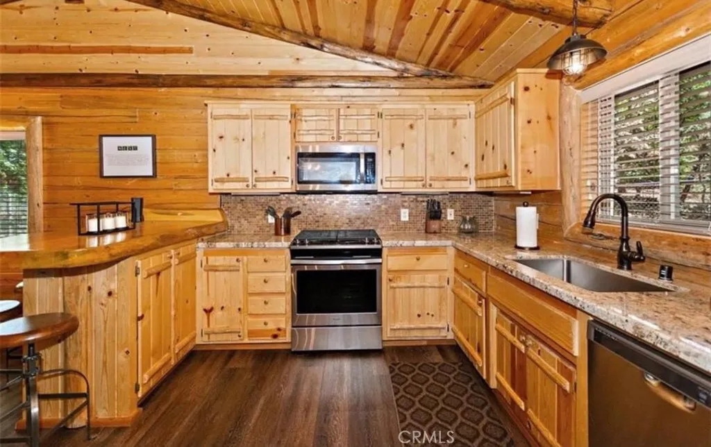 Wow! Wow! Wow! What a Gorgeous Log Cabin Home in the Moonridge Mountain Estates, Home was Remodeled in 2018 and has Large Front Porch Area for enjoying the area and the Seasonal Weather, This Single Story home has a unique Open Floor Plan gives you all the room for Entertaining Friends & Family, This 3 Bedroom / 2 Full Bath Cabin is Absolutely Beautiful with its combination of Rustic and Style you will feel right at home, Walk thru the front door to a Large Great Room that Boasts a Beautiful Slate Stacked Stone Fireplace with Custom Mantle & Hearth, High Beamed Ceilings showing Beautiful Wood lined interior W/Log Beams, Large Family Kitchen with Stainless Steel Appliances, also has a Dining Area and Breakfast Counter with Plenty of Room to hang out and enjoy this Beautiful Cabin, Large Master Bedroom with Large Separate Bathroom, 2 Guest Bedrooms Good Size with Closets, Guest Bathroom, Carpet in all the Bedrooms, Rest of home has Engage hybrid flooring (100% waterproof), Home is a Smart Home with 4x Motion Sensor Cameras, Smart Door Locks, Smart Thermostat, Smart Smoke and Carbon Monoxide Detector, Ceiling Fans Great Room & Bedrooms, Back Porch Area has Jacuzzi tub and BBQ, Large Front Driveway to park all your Cars, Large Front Yard w/Sprinkler System on Timer,