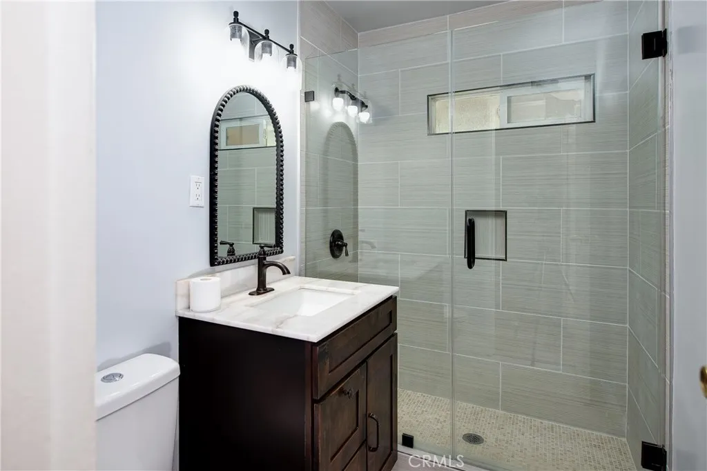 Upon entering you are greeted by a beautifully framed brick fireplace and open beam ceilings. From this charming living room, head off to the LEFT of the fireplace into your light-filled (sliding glass doors leading to the backyard) BONUS room (aka: playroom, office, art studio the possibilities are endless). Or head into the dining room by way of a beautiful arched doorway. Once there, its Order Up! as the chef serves you through the nostalgic pass-through window to the kitchen. Chef or Short Order cook, you will feel at home in this bright welcoming kitchen with beautiful Calacatta natural stone counters, plenty of storage space above and below and a newly tiled floor. Also, the convenience of having the washer/dryer hookups in the kitchen means no more trips to the garage to do the laundry! Leaving the laundry area follow the hall to the remodeled bathroom with a glass-doored full shower, replete with black accessories that add a luxurious feel. The stunning wooden vanity with its dark wood accents adds to the stylish features of this spa like bathroom. Lastly, the crisp three bedrooms boast charm with shuttered doors on the closets. And, with charm must come comfort. All windows in the house have been upgraded to new double-paned windows. The outside areas have purposely been left as a blank slate for your imagination. Create an outdoor oasis or many of them with the opportunities provided from this larger lot. This home has easy access to the 60 freeway where many freeways cross nearby making for an easier commute. Welcome home.