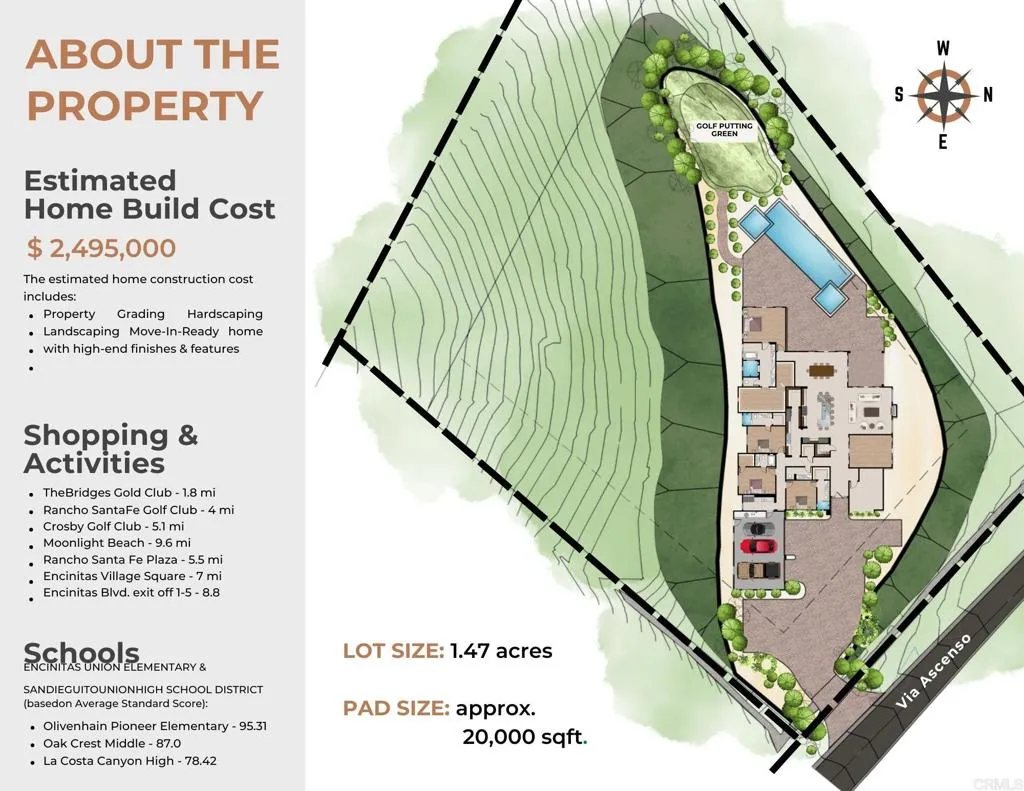 One of the last opportunities to build your dream luxury estate home in the prestigious gated Groves of Rancho Santa Fe! This stunning panoramic view lot offers space to create your dream property, with HOA guidelines possibly allowing for a main residence with resort-style backyard and two additional casitas or accessory dwellings. Nestled in the sought-after 92067 zip code, this is luxury living at its finest! Close to the esteemed Rancho Santa Fe Village this private gated community offers tennis courts and is surrounded by orange groves. All just a short drive from world-famous Del Mar Racetrack and Torrey Pines Beaches.