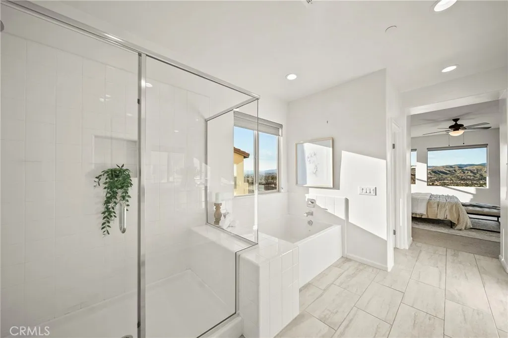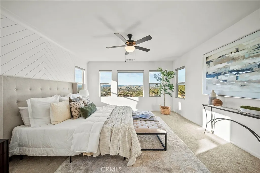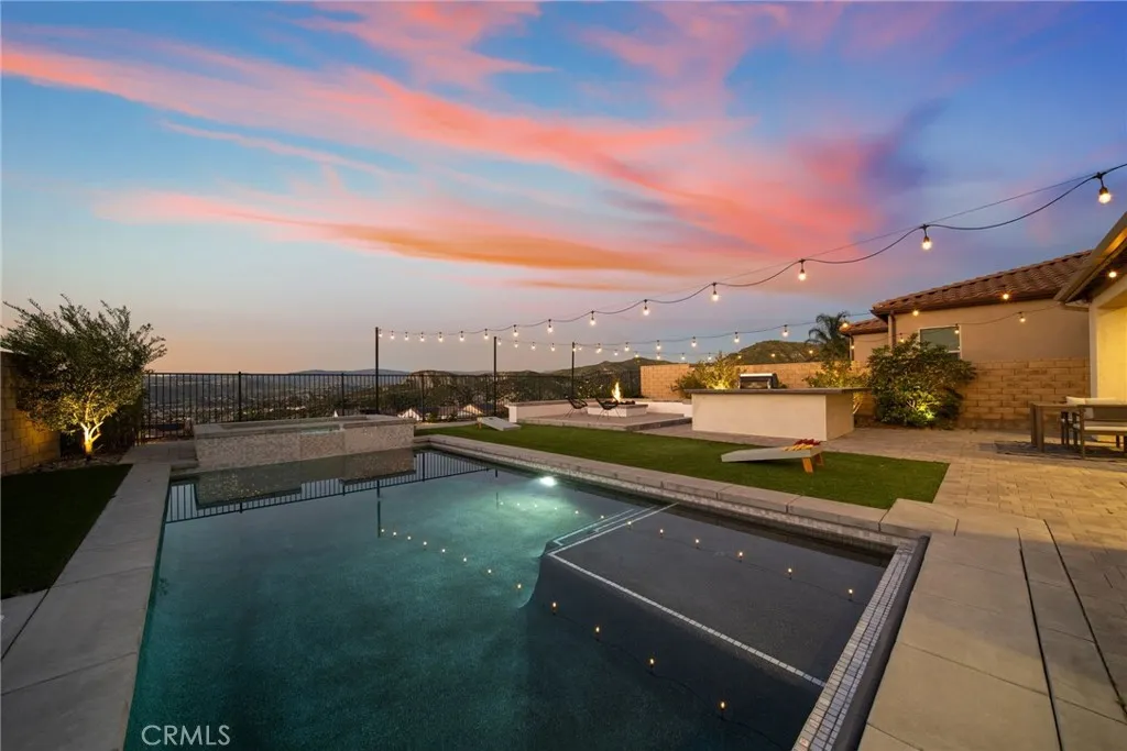 Stunning and luxurious view home in the gated Aliento Community with a resort-style backyard featuring a saltwater PebbleTec pool, spa, fire pit, and panoramic city light views. From the moment you step inside, the open-concept layout is filled with natural light, high ceilings, and a seamless flow between living, dining, and kitchen spacesideal for both everyday living and entertaining. A full bedroom and bath on the main level offer flexibility for guests or multi-generational living. The kitchen is both stylish and functional, featuring quartz countertops, an oversized island with bar seating, and a clean, modern design that opens directly to the main living areas. Positioned to take advantage of the homes elevated setting, the kitchen, dining, and living spaces enjoy a sense of privacy along with beautiful mountain and city views. The real showstopper is the backyard, highlighted seamlessly from the living room through expansive windows and sliding glass doors that open to a covered California room with outdoor dining and led lighting. Designed for both relaxation and unforgettable gatherings, this private outdoor retreat features a sleek saltwater pool and spa, expansive hardscape with turf landscaping, and multiple seating areas. Take in breathtaking mountain and city light views while enjoying evenings under caf lighting, hosting around the built-in BBQ, or unwinding fireside as the sky transitions from sunset to night. Upstairs, spacious bedrooms and a light-filled primary suite capture scenic views, creating a peaceful retreat to start and end your day. Enjoy daily