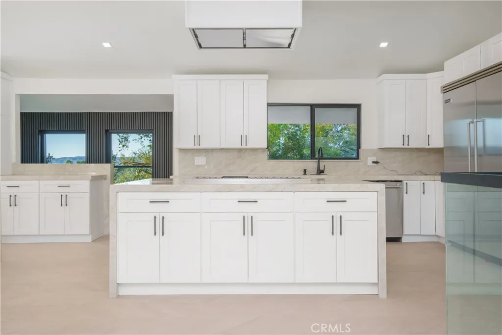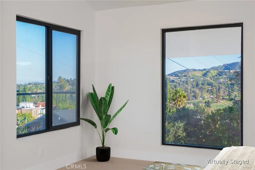 A Custom Estate home fully reimagined 3,320 sqft, set on an oversized secured flat lot, offering exceptional all new finishes. Enter through a new oversized custom pivot glass door onto 36x36 Pianetto porcelain tile, leading into the foyer. The home has been completely reimagined from wall to floors and ceilings, featuring all new finishes throughout. A newcustom glass staircase, connects the levels with elegance and safety. The main upstairs living level is the designed living room, dining area, and kitchen that is surrounded by incredible views. The bi-fold accordion door opens completely from the living room to the outdoor surrounded expansive balcony, creating an indoor-outdoor vibe under the open sky. This open-concept space is centered around a grand fireplace. New Herringbone-designed flooring are throughout the home, adding warmth and sophistication. All new led lighting thoughout. The all-new Master chefs kitchen has installed Professional Viking appliances, an extra-wide style refrigerator, dual ovens, a built-in microwave, and a Miele coffee station. Soft-closing cabinetry with oversized drawers, a barn-style accent sink, and a walk-in pantry, all topped with Taj Mahal countertops quartzite. An expanive master suite with a sitting area, an elegant quartz fireplace, a door to an outdoor balcony. The Primary bathroom is custom designed featuring dual vanities, a soaking tub, and a grand multi-jet rain shower. Luxurious tile finishes elevate the space, complemented by a smart toilet. A fully finished ex-large walk-in closet. Downstairs find 3 additional bedrooms new