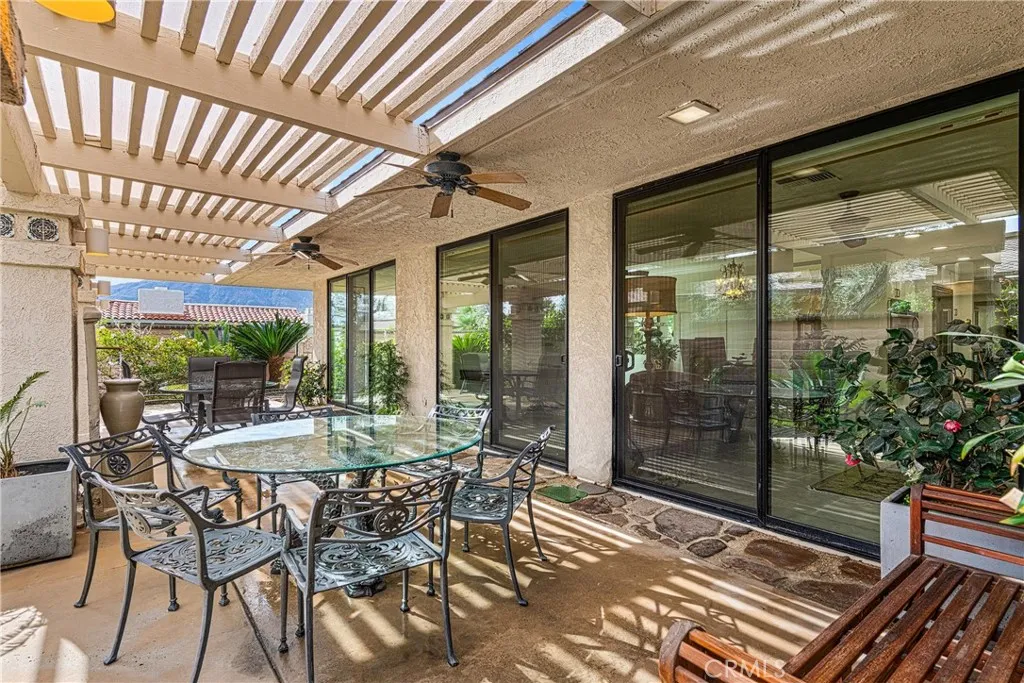Located in the highly sought-after The Springs Country Club, this extended Broadmoor floor plan, expanded by over 200 square feet, offers approximately 3,100 square feet of living space with three generously sized bedrooms, each with its own en-suite bath. The home features upgraded Milgard dual-pane windows throughout, plantation shutters, recessed lighting, and a well-designed layout that lends itself beautifully to personalization. Additional highlights include a wet bar, fireplace, and upgraded closets, complete with interior lighting that illuminates when the doors are opened. Existing Viking appliances, solid construction, and an air-conditioned garage, originally designed to accommodate a luxury vehicle provide a strong foundation for a thoughtful remodel tailored to todays standards. Set within one of Rancho Mirages most established country club communities, residents enjoy a signature 18-hole, par-72 golf course designed by Desmond Muirhead, spanning 6,637 yards and framed by sweeping views of the San Jacinto Mountains. The Springs offers a 48,000-square-foot clubhouse, practice facilities, and multiple dining options, including casual dining at The Oasis and fine dining in the main clubhouse.
