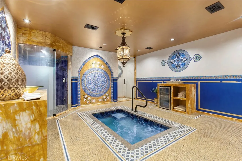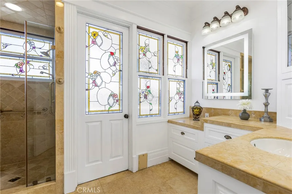 Located in the heart of coveted Eastside Costa Mesa, this extraordinary four-story architectural residence stands as one of the neighborhoods most distinctive homes. Privately gated and designed with remarkable scale, the property blends character, craftsmanship, and unforgettable living spaces. Inside, soaring vaulted ceilings and walls of windows fill the home with natural light, while beautiful stained glass details add artistry and charm throughout. The updated chefs gourmet kitchen features granite countertops, stainless steel appliances, wine refrigerator, center island, and walk-in pantry, opening seamlessly to generous dining and living areas designed for both everyday living and entertaining. A spectacular rotunda entertainment room serves as the architectural centerpiece of the home, showcasing a dramatic double-vaulted ceiling with surrounding windows, custom wood paneling, a hand-painted sky ceiling, and a striking chandelier sourced from Caesars Palace in Las Vegas. The space is complemented by an impressive built-in bar designed for hosting and gatherings. The residence offers three spacious bedroom suites, each with its own private bathroom. The grand primary retreat features a fireplace, wood flooring, heart-motif stained glass windows, and a circular staircase leading to a private bonus lounge and patio. Additional highlights include a private Turkish hammam spa with steam room and jacuzzi, solar panels, and an expansive three-car garage including limousine-length parking and workshop space. This remarkable residence combines architectural drama, luxury ame