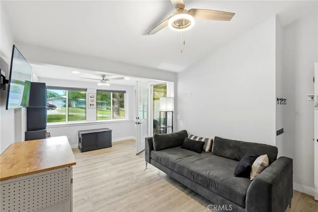 Welcome to 19237 Avenue of the Oaks Unit B, a fully renovated, turn key residence in the sought after Friendly Valley community of Newhall. This beautifully upgraded home blends modern design with everyday comfort, offering a light filled interior and thoughtfully curated finishes throughout. The kitchen has been completely reimagined with custom soft close cabinetry, designer tile work, LED under cabinet lighting, and a large upgraded sink with new plumbing. A full suite of matching LG appliances is included, along with stylish bar lighting and a glass display cabinet that adds both function and elegance. The bathroom has been fully remodeled with new floor and wall tile, modern fixtures, LED lighting, and a spacious walk in shower complete with safety features including a handle and built in seat. Additional highlights include new HVAC system, custom shelving in the primary bedroom closet, new windows and frames throughout, custom interior doors, updated flooring, and ceiling fans in every room. The home also features upgraded electrical with a new panel and wiring, along with enhanced lighting design that creates a bright and inviting atmosphere throughout. A unique bonus is the enclosed sunroom, which includes a professionally installed GE washer and dryer, sink and cabinet for storage. Both the front and back patios have been fully finished and include new electrical outlets. The rear patio offers a great view and is ideally located with close proximity to the community clubhouse, adding to the lifestyle appeal of this community. This is a rare opportunity to own a tru
