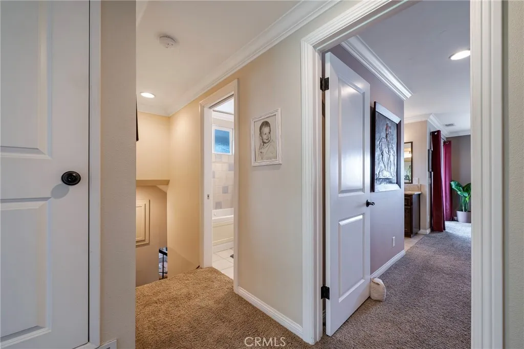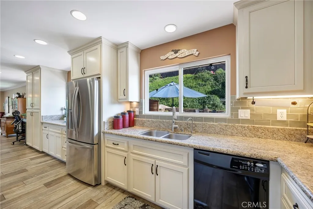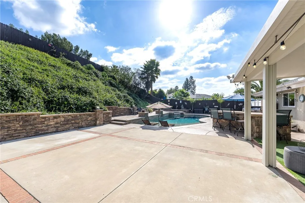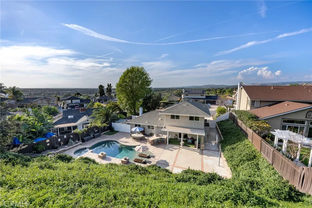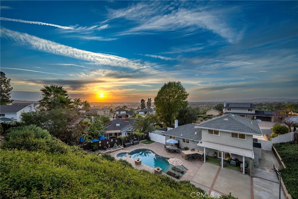 Perched at the top of Fairview Estates, this home delivers the ultimate backyard lifestyle with breathtaking panoramic views, exceptional privacy, and resort-style amenities. The expansive outdoor space is designed for both relaxation and recreation, featuring a saltwater pool and spa with waterfalls and copper fire pots, a built-in Jenn-Air barbecue island, Alumawood patio cover, private viewing platform, and a basketball court, a rare and highly sought-after addition that elevates the entire property. Fully remodeled from top to bottom, the home blends thoughtful design with quality finishes throughout. The open-concept main level seamlessly connects the living, kitchen, and dining spaces, all enhanced by durable luxury plank-tile flooring. The versatile dining area offers flexibility to accommodate an in-home office, workspace, or additional living area, adapting to your lifestyle needs. The chefs kitchen is the centerpiece of the home, featuring a large island, dual pantries, granite countertops, tile backsplash, stainless steel appliances, wine refrigerator, and insta-hot faucet. Milgard windows throughout bring in natural light while enhancing energy efficiency and comfort. Additional upgrades include plantation shutters, crown molding, recessed lighting, and ceiling fans. System improvements include central heating and air conditioning, a QuietCool whole-house fan, added insulation, and a whole-house water purification system. Upstairs, the expanded primary suite offers a peaceful retreat with a private balcony showcasing stunning sunset and city light views, a walk-