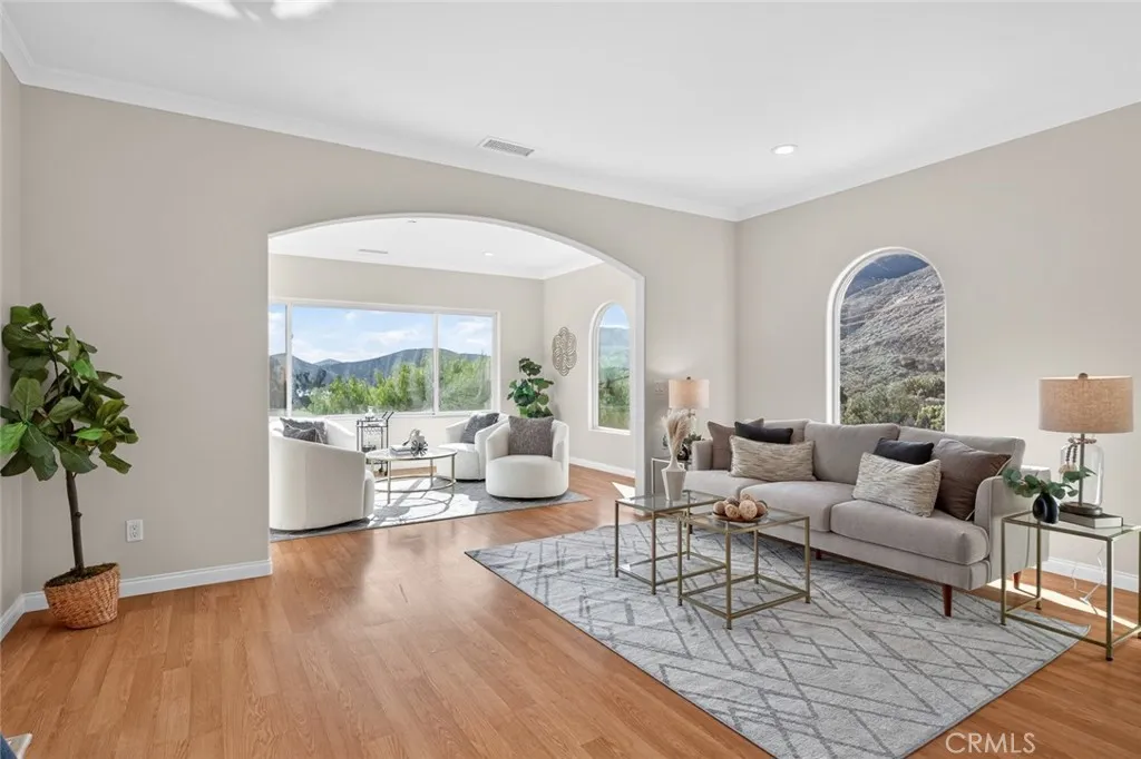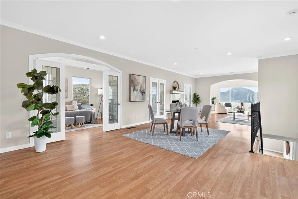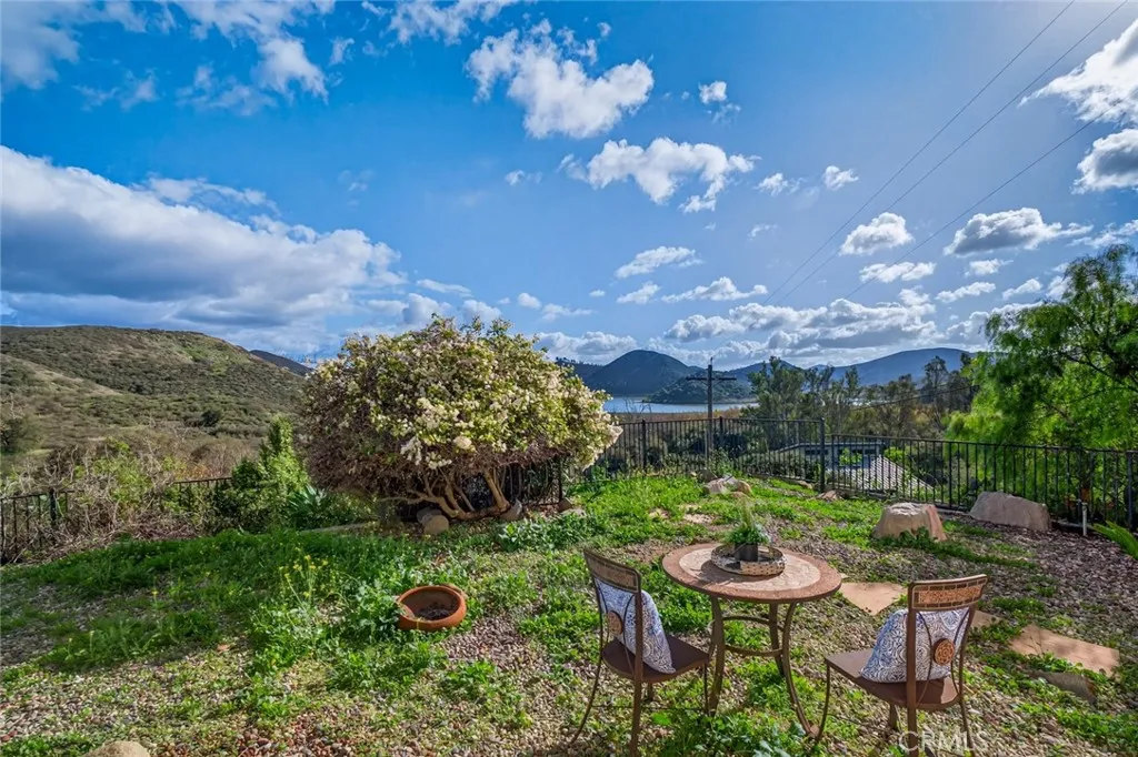 Enjoy sweeping views of Lake Hodges from this light-filled hillside home set in a quiet, nature-rich setting just minutes from everyday conveniences. Large windows bring the outdoors in, while thoughtful architectural details include crown molding, arched doorways, recessed lighting, and a cozy fireplace. The entry level features a spacious living room, a bedroom suite, a flexible office or den, and an enclosed patio ideal for year-round use. The lower level offers an upgraded kitchen, an oversized dining area for gatherings, a full bath, and a generous laundry and utility room. French doors open to the backyard for easy indoor-outdoor living. The top-floor private suite serves as a peaceful retreat with a walk-in closet, full bath, and stunning lake views. Close to hiking and biking trails, this home offers a rare blend of views, privacy, and accessibility.