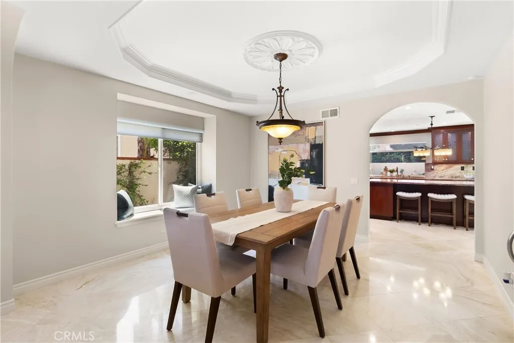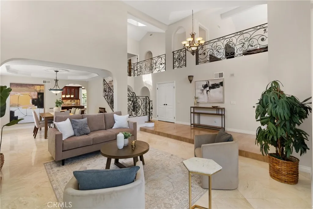 This exquisitely reimagined Estate II District residence, masterfully crafted by S&S Homes, graces the prestigious East Lake Village enclave in Yorba Linda. Encompassing 4 bedrooms, 3 bathrooms, and a grand bonus room (configurable as a 5th bedroom), this 3,850 sq ft sanctuary seamlessly marries opulent luxury with timeless sophistication. Enter to discover soaring cathedral ceilings, gleaming travertine floors, and a formal living room adorned with a bespoke fireplace and expansive windows that bathe the space in natural light. The adjacent dining salon, accented by intricate crown molding and a climate-controlled wine cellar, sets an unrivaled stage for lavish gatherings. The epicurean kitchen, a culinary masterpiece, boasts lustrous granite countertops, custom artisan cabinetry, a generous center island, and a professional-grade WOLF 6-burner range with a dedicated pot filler. This culinary haven flows effortlessly into a refined family room, featuring a stately fireplace and panoramic sliding glass doors that open to a serene backyard retreat. A luxurious downstairs bedroom, appointed with polished marble floors and direct outdoor access, serves as an ideal guest suite or private office, complemented by a full bathroom and an elegant laundry suite. Ascend to the palatial primary suite, a haven of tranquility with its own fireplace, expansive walk-in closet, new floor-to-ceiling windows, and private balcony overlooking verdant vistas. The spa-inspired ensuite bath offers dual vanities, a frameless glass shower, & abundant custom storage. Two additional upstairs bedrooms,