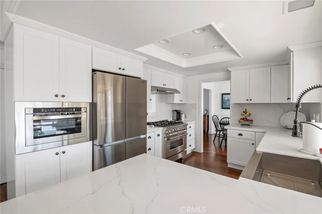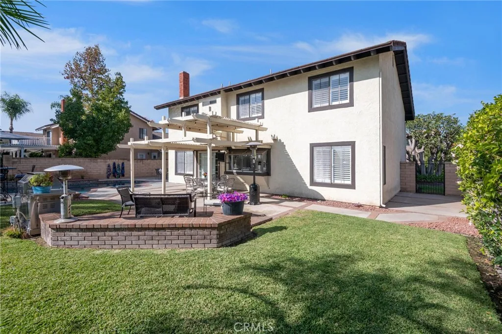 Set within one of East Yorba Lindas most coveted neighborhoods, this exquisitely upgraded residence embodies timeless sophistication and elevated California living. Positioned on a premier interior cul-de-sac, the home greets you with soaring vaulted ceilings, rich wood flooring every where except the stairs, plantation shutters, and an abundance of natural light that enhances the graceful flow between formal living and dining spaces. The designer-remodeled kitchen is both striking and functional, appointed with crisp white shaker cabinetry, quartz surfaces, stainless steel appliances, and a farmhouse sink. It opens seamlessly to an inviting family room highlighted by a classic brick fireplace and custom built-ins an elegant yet comfortable setting for entertaining or relaxing evenings at home. The expansive primary suite serves as a serene retreat, featuring a dedicated built-in workspace, mirrored wardrobes, and a spa-caliber bath thoughtfully redesigned with dual vanities and an oversized walk-in shower. Generously proportioned secondary bedrooms and tastefully curated baths continue the homes elevated aesthetic and attention to detail. Outdoors, the private backyard transforms into a true resort-inspired sanctuary. A sparkling pool and spa anchor the space, complemented by a covered patio, multiple conversation areas, built-in BBQ, manicured lawn, and open-sky views creating an exceptional environment for refined entertaining or tranquil relaxation. A three-car garage, exceptional natural light, and evident pride of ownership complete this remarkable offering. Ideally