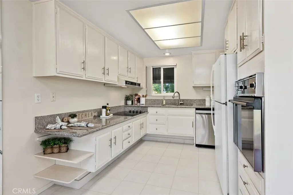 Discover the perfect blend of style and comfort in this charming Castilla upper-level, single story 2 BR, 2 BA condo located in the premier 55 and over community of Laguna Woods. This beautifully maintained residence offers an open floor plan with an abundance of natural light, creating a warm and inviting atmosphere. Step into the spacious great room, where you can relax or entertain guests while enjoying the open views from the oversized balcony and wall of windows. The home features dual pane windows and a slider, ensuring energy efficiency and tranquility. The bright kitchen boasts granite countertops, white cabinets, and seamlessly opens to the dining room, perfect for hosting dinners with friends and family. With two spacious bedrooms and two remodeled bathrooms, this condo provides ample space for comfort and privacy. The bathrooms are adorned with quartz countertops and updated fixtures, adding a touch of elegance. Wood laminate flooring throughout enhances the home's appeal, and there's plenty of storage space to keep everything organized. Residents of this fabulous community have access to a wealth of amenities designed for an active senior lifestyle, including golf, tennis, pickleball, a clubhouse, and so much more. Conveniently located with easy access in and out from Gate 6, this is a home you do not want to miss. Fresh, clean, and ready for you to move income live the lifestyle you deserve at Laguna Woods!