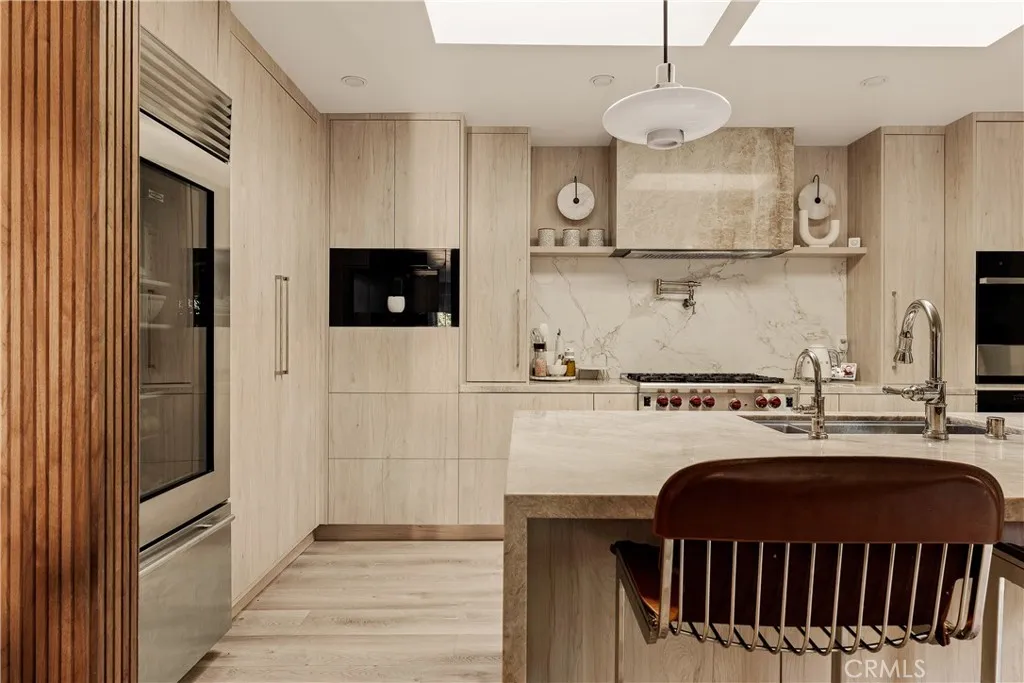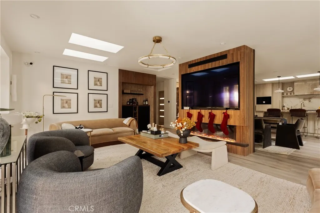 Set on a picturesque, tree-lined street just South of the Boulevard, this beautifully reimagined 3-bedroom, 2-bath residence offers 1,995 square feet of thoughtfully designed living space on a 6,000-square-foot lot. The home blends warmth, functionality, and refined modern design, with all major systems fully updated for turnkey living. Abundant natural light pours in through skylights, highlighting rich hardwood floors and an open, airy layout ideal for both everyday living and entertaining. The expansive kitchen serves as the heart of the home, featuring Taj Mahal Quartz countertops, a substantial center island with generous seating, Sub-Zero refrigeration, Wolf appliances, a built-in espresso machine, and sleek European-style cabinetry. Open to the dining and living areas, the space is enhanced by recessed lighting, smart lighting, built-in speakers, and a striking fluted wood fireplace, creating a sophisticated yet inviting atmosphere. The home is fully Google Homeintegrated, allowing seamless control of lighting and smart features throughout. The primary suite offers a serene retreat with ample windows and multiple closets, while both bathrooms have been tastefully updated with timeless finishes. Significant upgrades include all-new plumbing, electrical, HVAC system, insulation, drywall, and stucco, along with a new water heater, upgraded door hardware, and enhanced exterior lightingdelivering peace of mind and modern efficiency. Outdoors, the private backyard features a generous lawn and a gas line ready for a BBQ, perfect for relaxed California living and entertainin
