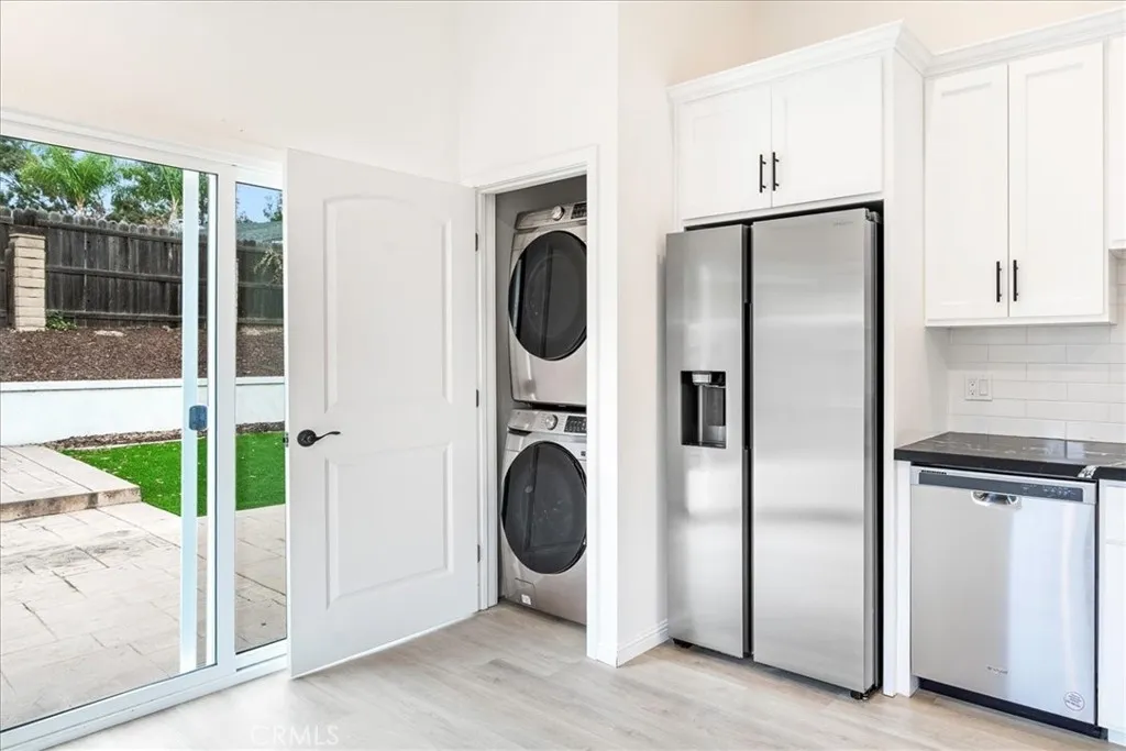 Welcome home to this beautifully remodeled 3-bedroom, 2-bathroom single-story residence tucked away on a quiet cul-de-sac in Mission Viejo. This home offers modern comfort, a functional layout, and great outdoor spaceperfect for easy living and entertaining. Enjoy a spacious backyard with low-maintenance artificial turf and cement patios in the front and back, ideal for relaxing outdoors or hosting friends. Inside, the updated kitchen features newer stainless-steel appliances, soft-close cabinets, pull-out shelves, a Lazy Susan, dual pull-out trash and recycling bins, and a built-in spice rack. A stackable washer and dryer are conveniently located in the kitchen area for added ease. A water line is ready for a refrigerator with a dispenser or ice maker. The open floor plan connects the kitchen and living area, filling the space with natural light. Both bathrooms have been fully renovated with modern vanities, soft-close illuminated toilets, updated fixtures, and dual mirrored medicine cabinets. Recessed lighting with dimmer switches adds warmth and ambiance throughout the home. Located close to top-rated schools, beautiful parks, hiking trails, shopping, and sports venues, this home combines comfort with convenience. Optional Lake Mission Viejo membership is available for access to boating, swimming, concerts, and more. This is a wonderful opportunity to lease a move-in-ready home in one of Mission Viejos most desirable neighborhoods!