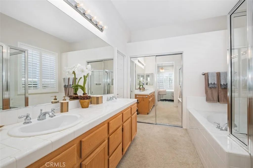 This home is an exceptional value in the highly desirable Palmia senior community. This well-maintained single-story residence features 2 bedrooms and 2.5 baths, with the second bedroom currently used as an office and not offering a closet. The inviting floor plan includes a formal living room, formal dining area, and a spacious family room with a fireplace, all adjacent to a large kitchen with abundant storage and a charming breakfast nook. The primary suite is privately situated at the back of the home and features a double-sink vanity, separate soaking tub and stall shower, a large customized walk-in closet, and a private water closet. At the front of the home, the en suite guest bedroom provides comfort and privacy for visitors, while the powder room is ideal for guests. The oversized laundry room offers extensive storage cabinets, a laundry sink, and direct access from the garage. Outside, the low-maintenance backyard is perfect for relaxing or entertaining family and friends. Additional upgrades include epoxied plumbing pipes for leak prevention, newer heating and air conditioning, shutters throughout, surround sound in the family room, new toilets, ceiling fans, epoxied garage floors, and ample overhead garage storage. Palmia is second to none, offering resort-style amenities including an 18-hole putting green, tennis, paddle tennis, pickleball, pool and spa, bocce, fitness center, billiards, card room, library, beautiful clubhouse, social clubs, parties, and much more. Residents also enjoy access to Lake Mission Viejo, featuring sandy beaches, boating, and popular s