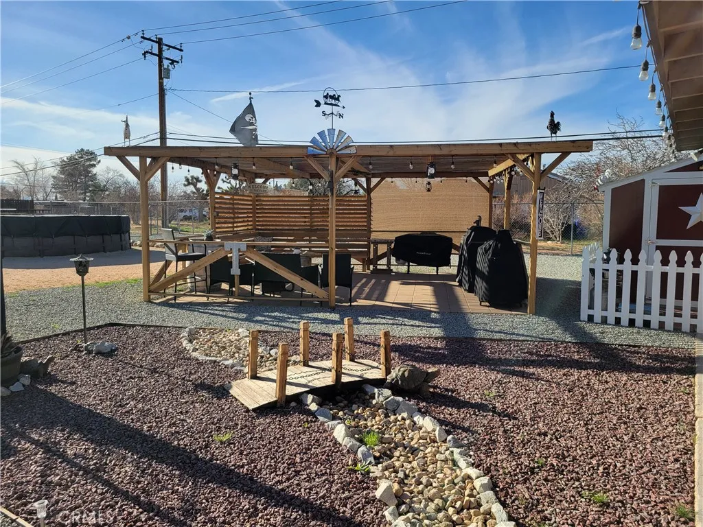 Discover this beautifully updated home with modern finishes and soothing gray tones throughout. The bright kitchen features granite countertops, and every room has a ceiling fan for added comfort. Practical upgrades include two water heaters and a paid-off solar system at close of escrow. Outdoors offers an entertainers dream: an above-ground pool and Jacuzzi, an extra-large pergola, an 8'10' storage shed plus a fully finished 8'12' shed with a mini-split (perfect for an office or studio). The front yard is low-maintenance desert landscaping, and the landscaped backyard is divided into three fenced areas each with double-door openings to allow drive-through access. Comfortable, functional, and move-in ready.