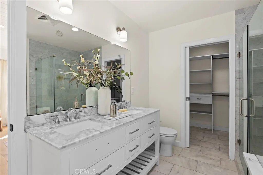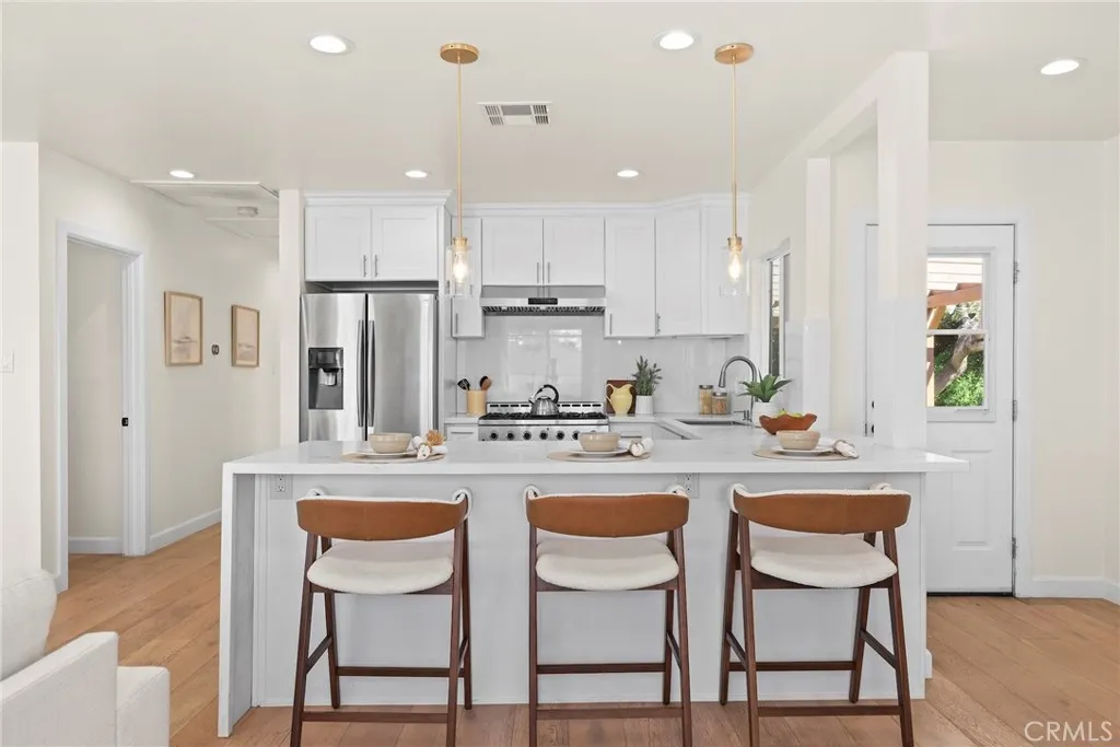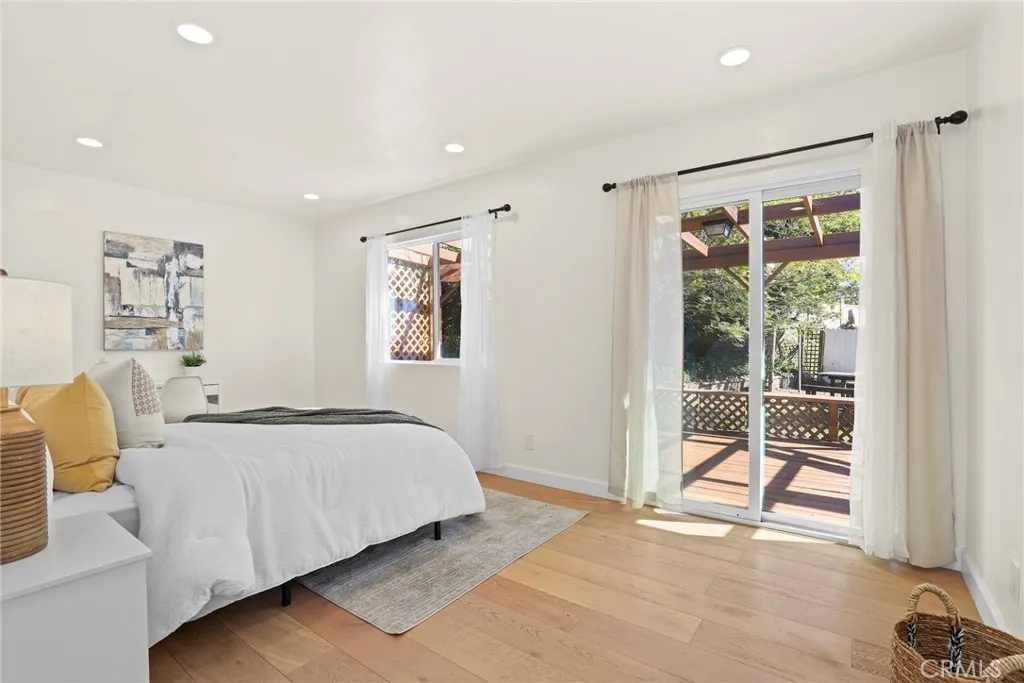 Beautifully remodeled, single-story home, ideally situated on an oversized, quiet cul-de-sac lot, offers exceptional indoor/outdoor living. The interior has been updated to a modern style, featuring wide-plank floors, recessed lighting, and a highly functional floor plan. The heart of the home is the great room, which encompasses a wonderful kitchen with quartz countertops, ample storage, and a breakfast bar overlooking the living and dining areas. Outside, a large patio is perfect for gatherings, while the spacious yard provides plenty of room for kids and pets. Mature trees offer shade, and fruitful orange trees yield seasonal harvests. The primary suite is a true retreat, boasting a large bedroom with a cozy fireplace, a sumptuous bathroom complete with a dual vanity, soaking tub, and walk-in closet. Separately located on the other side of the home are three generously-sized secondary bedrooms. These feature large mirrored closets, with one offering an ensuite bathroom, and the other two sharing a hallway bathroom. Enjoy the comfort of central AC and the peace of a quiet neighborhood, all while benefiting from the convenience of this prime location.