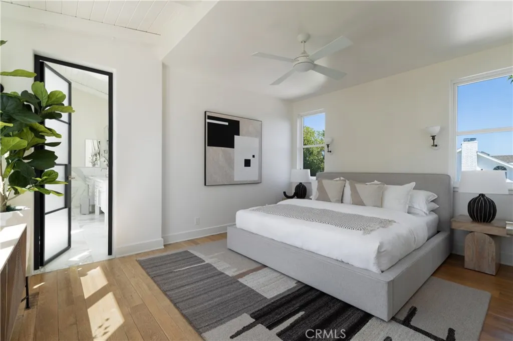 Welcome to 2217 Laurel Place a bespoke architectural gem tucked away on a quiet cul-de-sac in coveted Newport Heights. Inspired by the clean lines and warmth of a Swedish coastal retreat, this one-of-a-kind home (Hem in Swedish) was designed to honor the natural elements. Built thoughtfully with sustainable, zero waste construction and careful selections throughout, the striking vertical lines, a bold asymmetrical roof, and clerestory windows form a sculptural silhouette dramatic yet harmonious flooding interiors with natural light while celebrating the outdoor spaces. Inside, the vaulted living room makes a statement with tongue-and-groove ceilings, exposed beams, and a central fireplace flanked by inset French doors. Reclaimed wood floors flow through to the dedicated dining space, chefs kitchen and wrap-around bar all connected by oversized sliding glass pocket doors opening onto the lush, inviting yard. The kitchen is a study of form and function featuring natural soapstone countertops, Wolf range, Sub-Zero refrigerator, dual farmhouse sinks, walk-in pantry, and a custom, hand-sourced light fixture. Outside, the mature trees and garden provide a beautiful private backdrop for enjoying the perfect Newport Beach climate. The covered patio with built-in BBQ and adjacent fire pit area creates a setting perfect for gathering, lounging and celebrating under the stars. Upstairs, two bedrooms (one with a balcony) feature walk-in closets and a Jack-and-Jill bath, while a third bedroom enjoys a private en-suite. A cozy loft nook provides space for reading or play. The primary sui