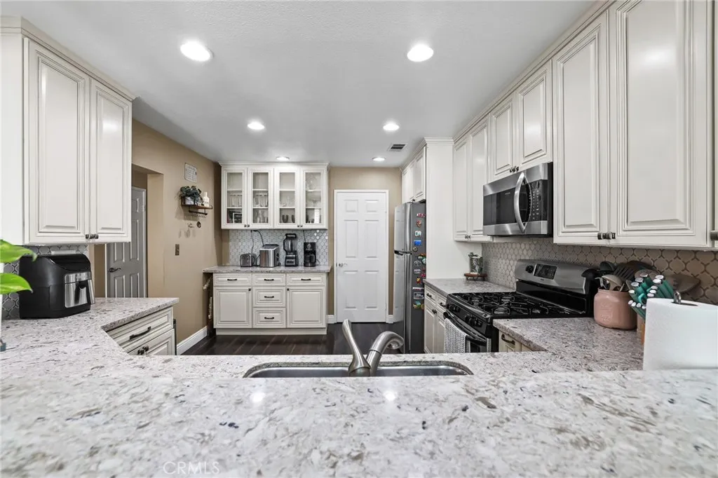 Welcome to this beautifully upgraded home in the highly desirable Laings First Edition community in Corona Hills. This spacious residence offers 3 bedrooms, 2.5 bathrooms, and an open-concept layout designed for modern living. Natural light pours into the living area through a skylight, creating a warm and inviting ambiance. The updated kitchen is a showstopper, featuring quartz countertops, custom cabinetry, a designer mosaic backsplash, and stainless steel appliances. A cozy breakfast bar flows seamlessly into the dining and living spaces, where youll find a charming fireplace, luxury vinyl plank flooring, crown molding, and ceiling fans that add comfort and style throughout. Enjoy indoor-outdoor living with shuttered sliding doors that open to a private front patio, plus a balcony off one of the bedrooms. The luxurious primary suite is your personal retreat, complete with a large walk-in closet and private en-suite bath. This sought-after community offers residents access to a sparkling pool and lush gardens, while a 2-car attached garage provides convenience and storage. Perfectly located, youre just a short stroll to shopping, dining, movie theaters, parks, and hiking trailswith easy access to the 91 and 15 freeways. Low HOA and low taxes make this home an even greater value! ***This home qualifies for a $10K forgivable loan!***