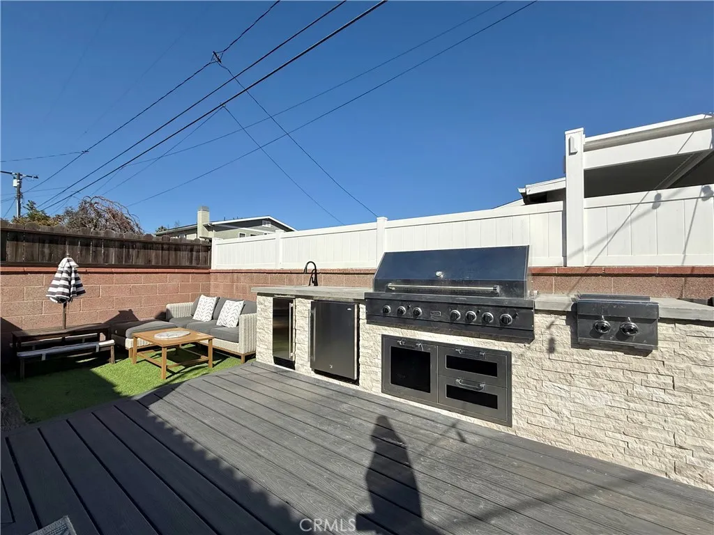 Step into a warm and inviting South Torrance home, thoughtfully upgraded for modern living and just moments from award-winning schools, Torrance Beach, Del Amo Fashion Center, and nearby park. Enter through charming blue Dutch door, set behind a private, enclosed front yard with grass and tucked away in a quiet residential neighborhood. Inside, the upgraded kitchen features waterfall quartz countertops, stainless steel appliances, and counter seating, ideal for everyday dining or hosting. Off the kitchen lies a versatile flex space that can be used as a sitting area, dining room, playroom, or home office. Sliding glass doors lead to a covered patio strung with caf lights and outfitted with swings, perfect for relaxing or entertaining. The backyard is a fully loaded entertainers dream, showcasing a brand-new, top-of-the-line outdoor kitchen complete with BBQ, sink, burners, refrigerator, and ice machine. A grassy lawn and a newly built deck provide the perfect setup for lounging or dining al fresco. Inside, the sunlit living room features a stylish stone fireplace and overlooks the manicured front yard. The home includes upgraded bathrooms, one of which offers a separate tub and tiled shower, a quartz vanity, and sleek black fixtures. All bedrooms offer direct access to the backyardideal for embracing the indoor-outdoor California lifestyle. The garage has been fully transformed into a versatile bonus space, complete with a second kitchen setup, laminate floors, and laundry areaperfect for a home office, studio, or play area. Additional upgrades include solar panels for redu