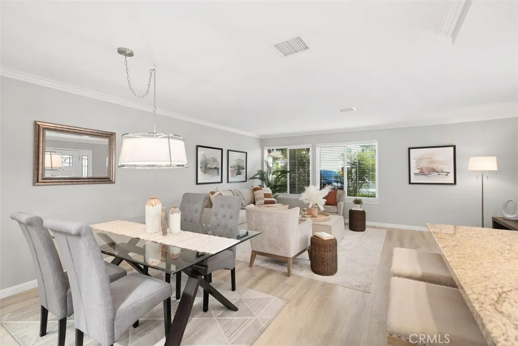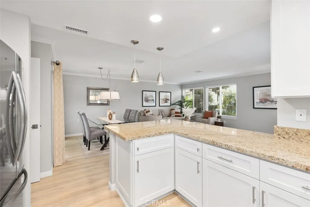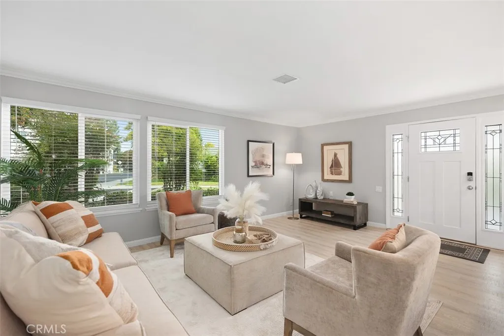 Remodeled "New Valencia" CONDO cottage - no steps and no one above or below! This popular floorplan features a huge tiled and partially covered private patio area with 2 storage closets and vinyl gated entry. Beautiful front door with leaded glass and matching side panels welcomes you to this gorgeous home. Interior features central HVAC, dual pane windows, smooth ceilings, updated crown and base molding, laminate flooring, paneled doors, updated outlets and switches plus so much more! Great room concept with spacious living room, adjacent dining space and opened kitchen updated with white shaker cabinets, granite counters, breakfast bar, stainless appliances, recessed lights and window over the sink looking to the front patio. Atrium area is protected from the sun by professionally installed, removable sun shades. Guest bedroom enjoys window looking out to the atrium and paneled floor to ceiling closet doors with organizers behind maximizing the storage space. Stack washer/dryer conveniently located in the hallway. Spa-like guest bathroom brightened by a large skylight and contains beautiful, tiled walk-in shower with glass enclosure to complement the remodeled vanity area. Stepping into the primary suite, you'll love the window looking out the patio plus a small added window above the bed to capture the morning sun! This room also features floor to ceiling closet doors and organizers. Primary en-suite houses a dual sink vanity and larger tiled walk-in shower with seat and glass enclosure. This home is move-in ready and waiting for you! Close to Clubhouse 4 to indulge your