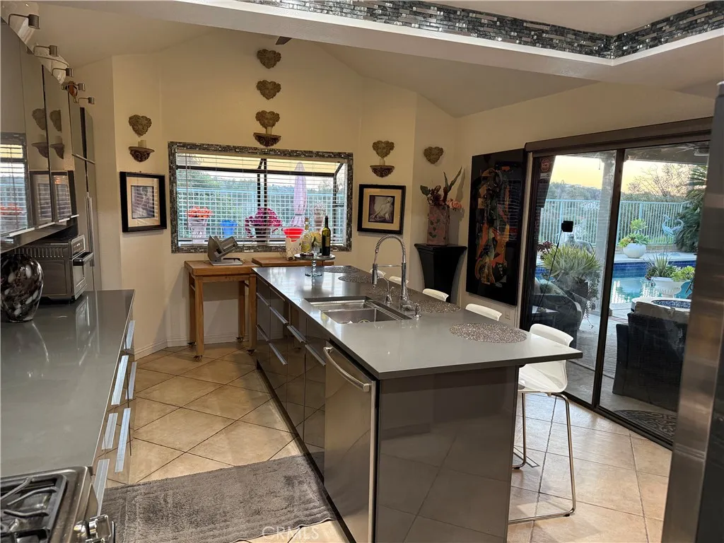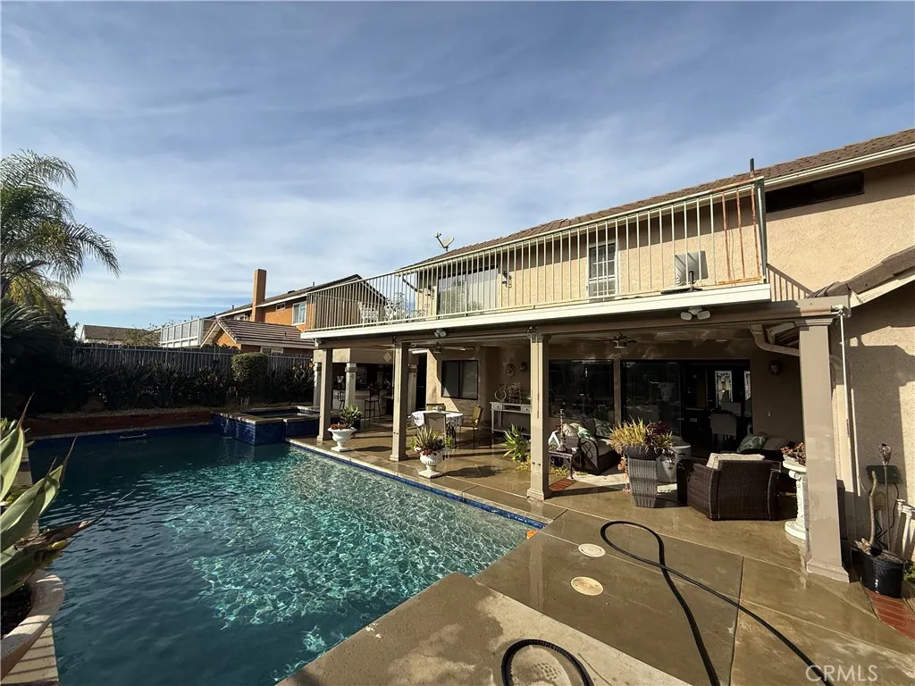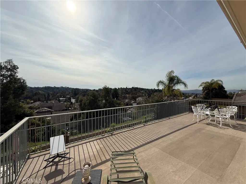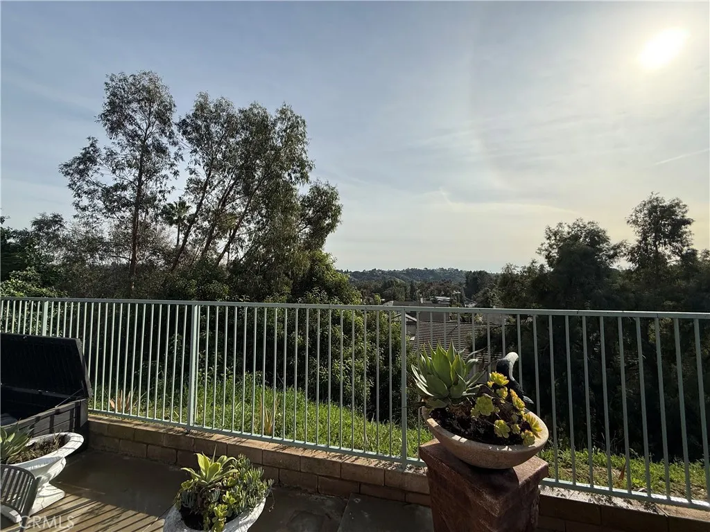 Experience elevated living in this hilltop residence filled with natural light, vaulted ceilings, and panoramic sunset views. Designed for comfort and entertaining, open-concept living spaces flow seamlessly, while expansive windows frame serene vistas and create a warm, inviting atmosphere throughout. The remodeled kitchen is a showpiece, featuring modern gloss cabinetry, quartz countertops, a glass tile backsplash, and stainless steel appliances, including a built-in microwave and five-burner gas range. A large center island with sink and dishwasher offers generous prep space and seating. A charming bay window is perfect for an indoor herb garden, and a sliding glass door leads directly to the covered patio. The main level offers flexibility, including a full bathroom with walk-in shower and a walk-through layout providing convenient access to the second covered patio and pool area. With space that can easily convert back into a downstairs bedroom, complete with bay window and mirrored accent wall. Additional features include a glass-enclosed alcove, double-sided fireplace, and laundry room with abundant storage. Upstairs, the primary suite retreat with vaulted ceilings, two spacious closets (one a walk-in), a built-in nook (currently coffee bar), and balcony access showcasing incredible views. The ensuite bath features dual sinks, a soaking tub, and separate shower. Two additional bedrooms share a Jack-and-Jill bathroom, with one offering direct balcony access. Step outside to a resort-style backyard oasis. Multiple seating areas capture spectacular sunsets, while a pool