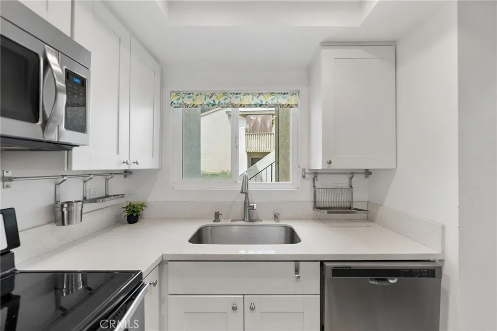 Turnkey, ground-level condo in the heart of Mission Viejo offering comfort, convenience, and style. This 2-bedroom, 1-bath home features a functional, open layout ideal for everyday living. Recently refreshed with new interior paint throughout, and brand-new carpet in both bedrooms, this home feels bright and inviting from the moment you step inside. The kitchen showcases updated finishes including quartz countertops, soft-close white cabinetry, stainless steel appliances, and modern lighting. Both bedrooms are well-proportioned with ample closet space, while the bathroom has been upgraded with contemporary finishes. Large living room with sliding door that leads out to the oversized backyard with artificial turf provides the perfect flow for entertaining or just relaxing after a busy day. Additional highlights include dual pane windows, newer water heater, vinyl wood flooring, and this unit has been re-piped. Additionally, membership to the Lake Mission Viejo Homeowners Association grants access to exclusive amenities such as a clubhouse, private beach, and a variety of community activities including boating, fishing, and summer concerts. This home is conveniently located close to freeways, Shopping, Restaurants, and award-winning schools. Don't miss the opportunity to make this exceptional home yours and experience the unparalleled lifestyle offerings of Mission Viejo.
