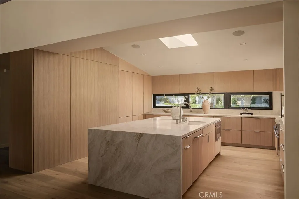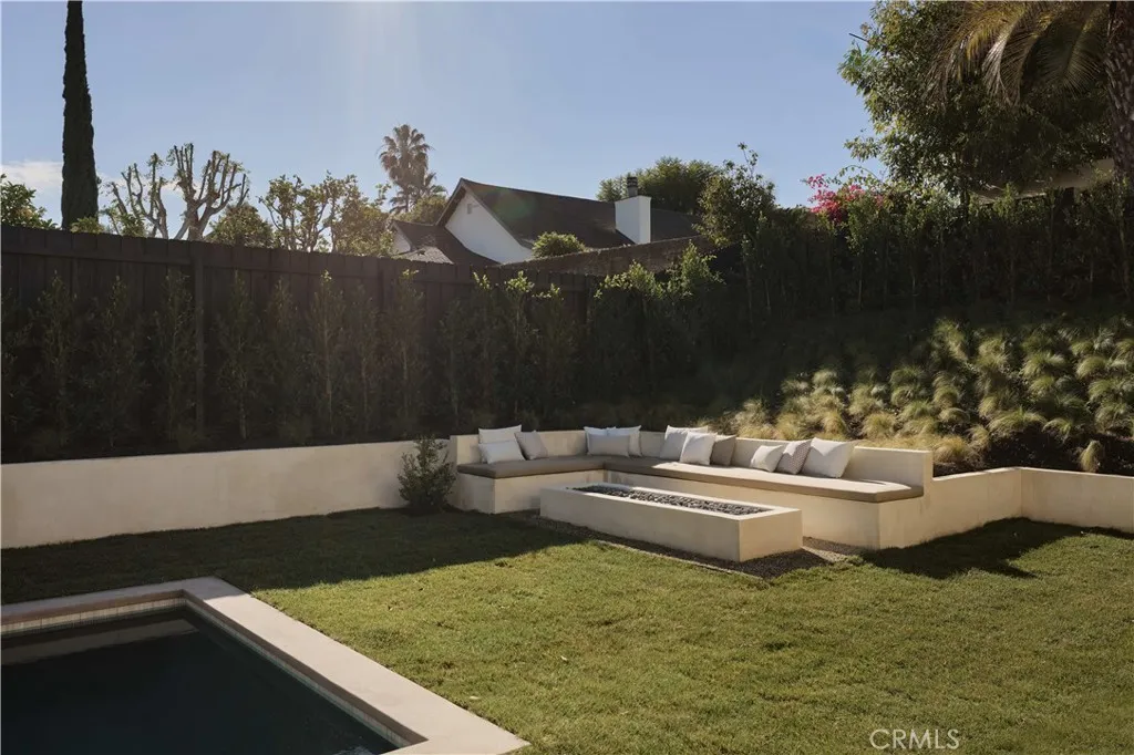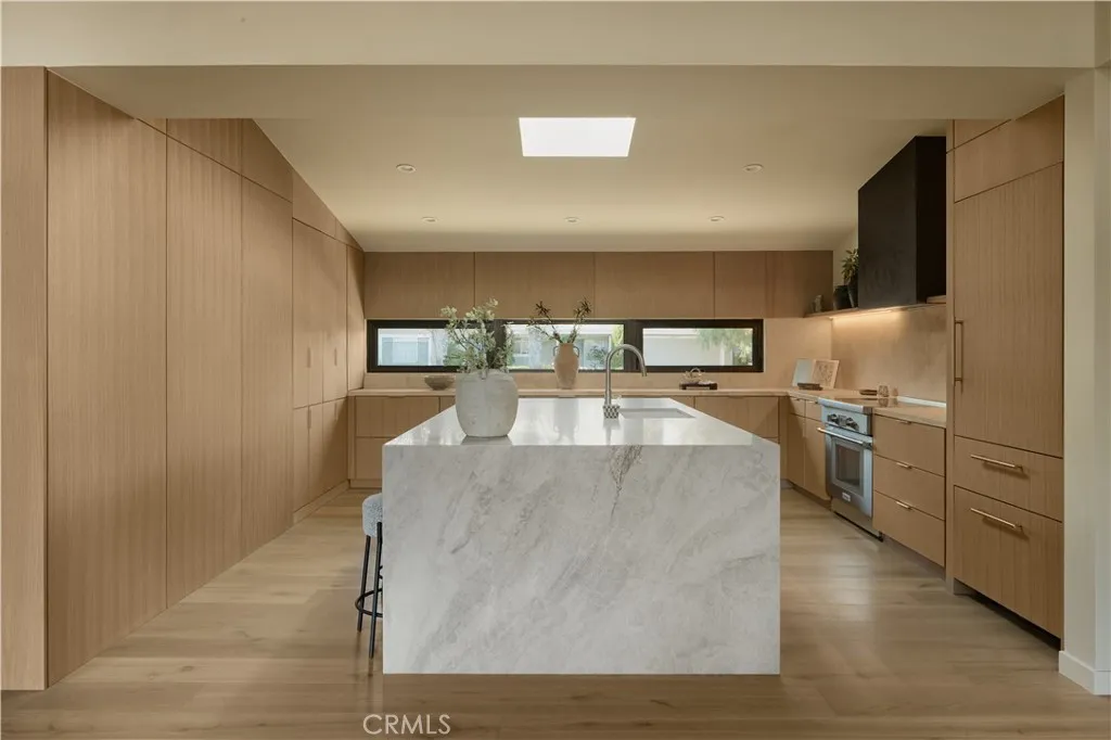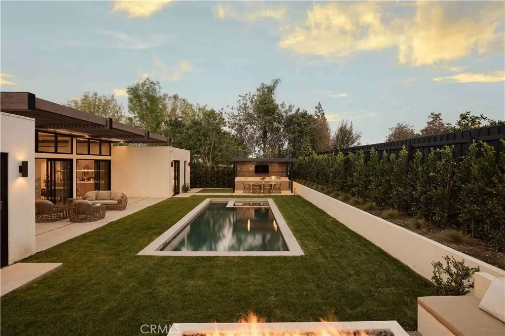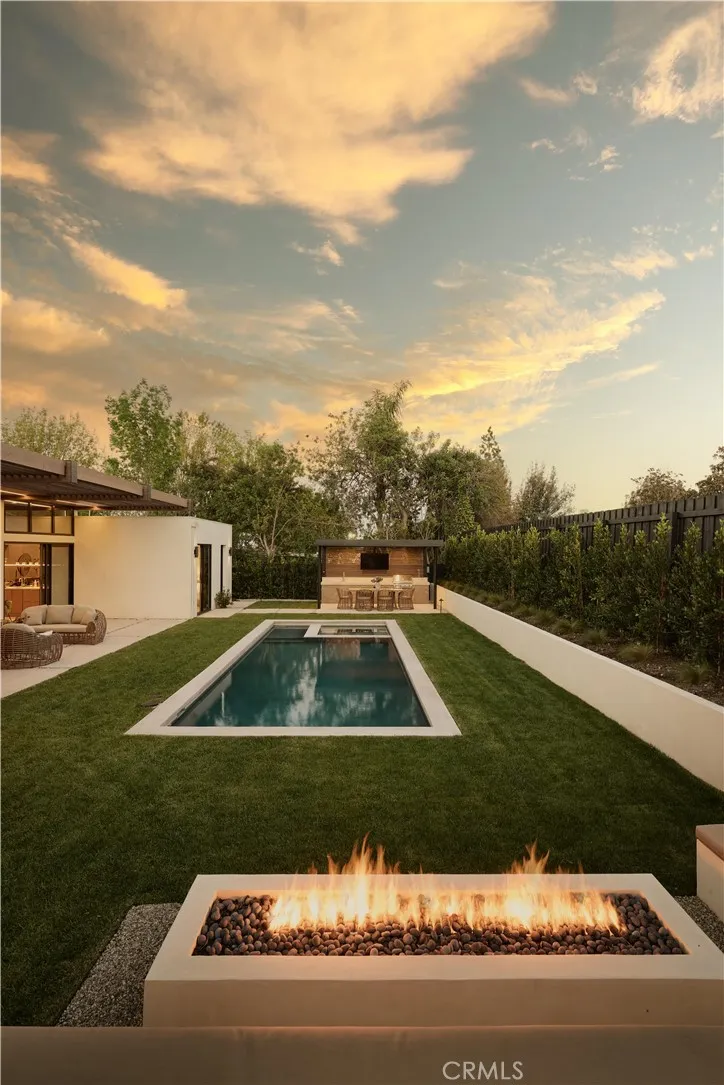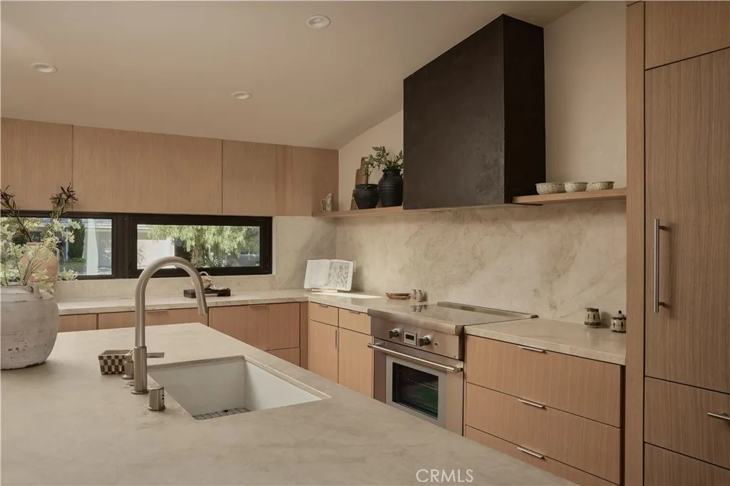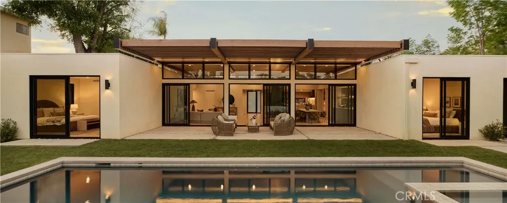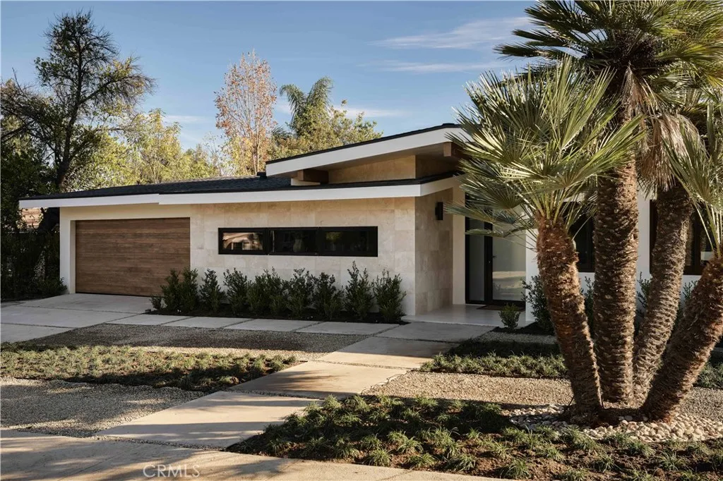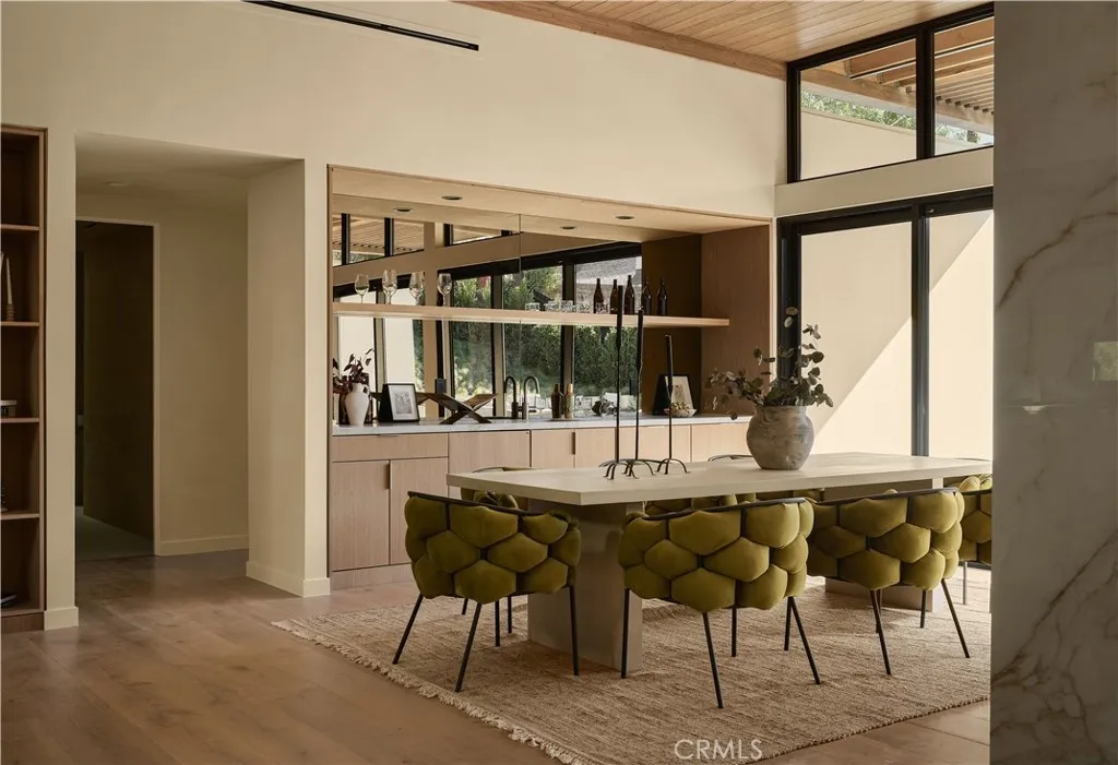 An iconic Charles Du Bois mid-century home, thoughtfully and completely reimagined by Wyota Workshop, blending timeless architectural integrity with modern volume, warmth, and livability. This 4-bedroom, 3.5-bath residence honors the original spirit of Du Bois design while elevating it for contemporary living. The homes layout has been reworked to introduce a dramatic 36-foot-long living room with 12-foot ceilings, creating an expansive sense of scale and light rarely found in homes of this era. A cantilevered ceiling extends seamlessly toward the outdoor patio, reinforcing true indoor-outdoor living and allowing the interior spaces to flow effortlessly into the landscape. Throughout the home, custom oak cabinetry has been meticulously designed and built in every space, offering warmth, cohesion, and exceptional storage without compromising clean architectural lines. The dining room is anchored by a refined wet bar with wine refrigeration, making it ideal for entertaining. The kitchen is both sculptural and functional, featuring Thermador appliances, natural Taj Mahal quartz countertops, and a striking waterfall island that serves as the heart of the home. The residence offers dual primary suites, thoughtfully positioned on opposite sides of the home to provide privacy and flexibility perfect for guests, in-laws, or work-from-home needs. Outside, the property continues to impress with a modern linear pool and spa, a covered outdoor BBQ area, and multiple zones designed for relaxation and entertaining. A poured-in-place concrete firepit with custom bench seating anchors the