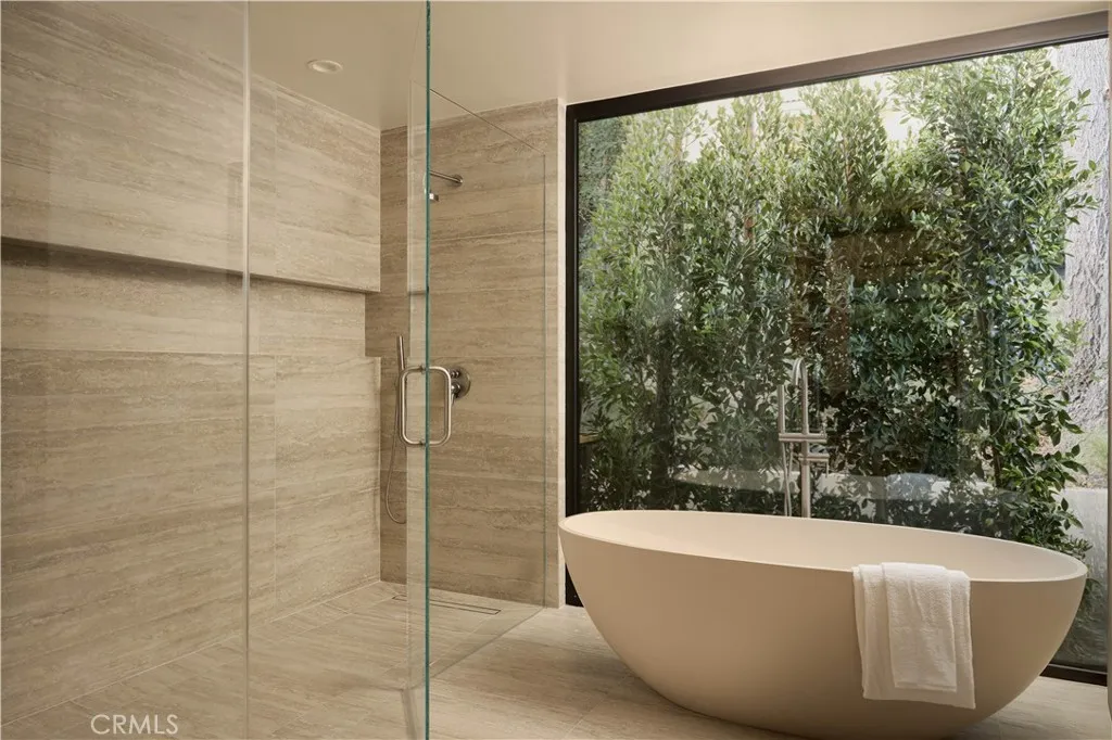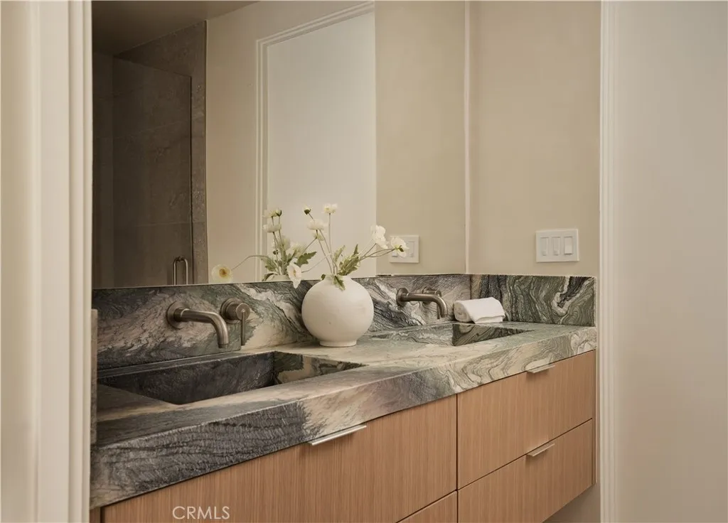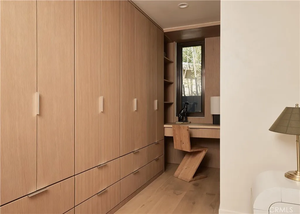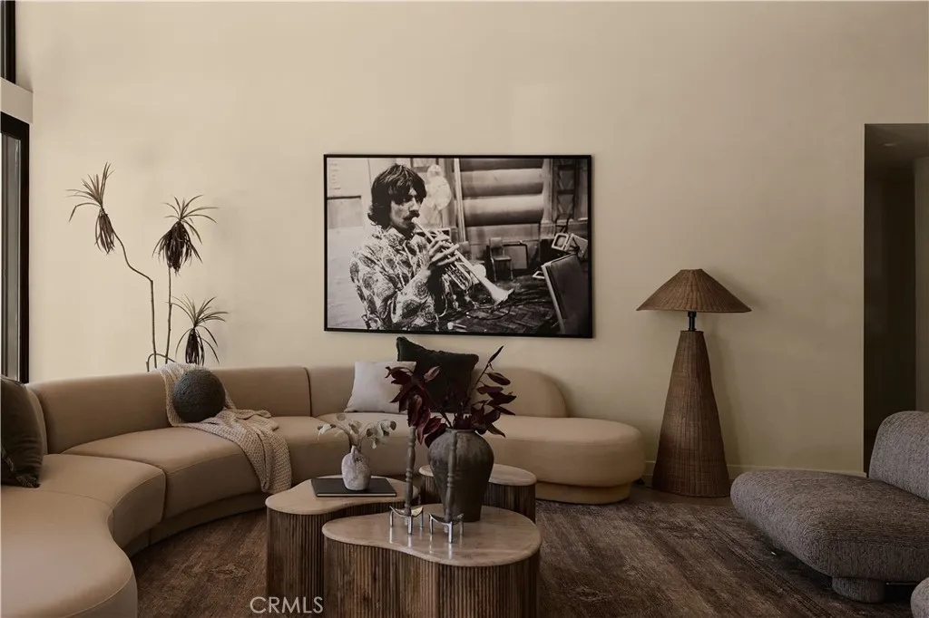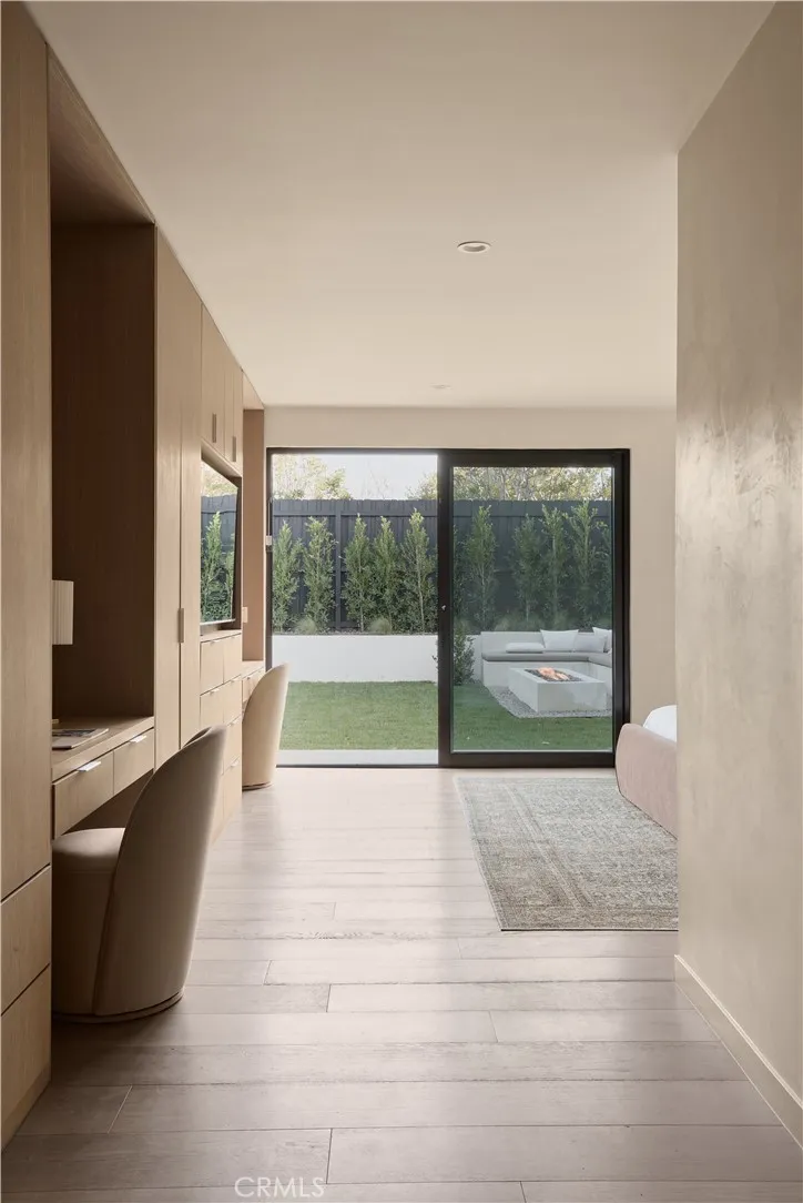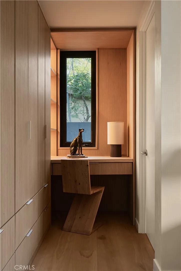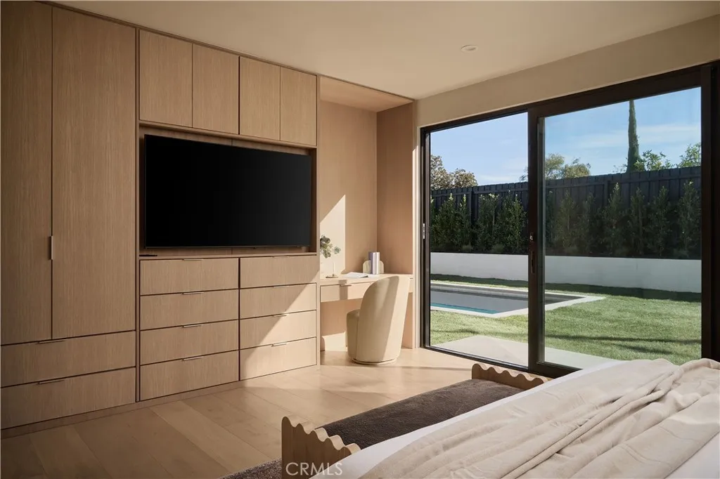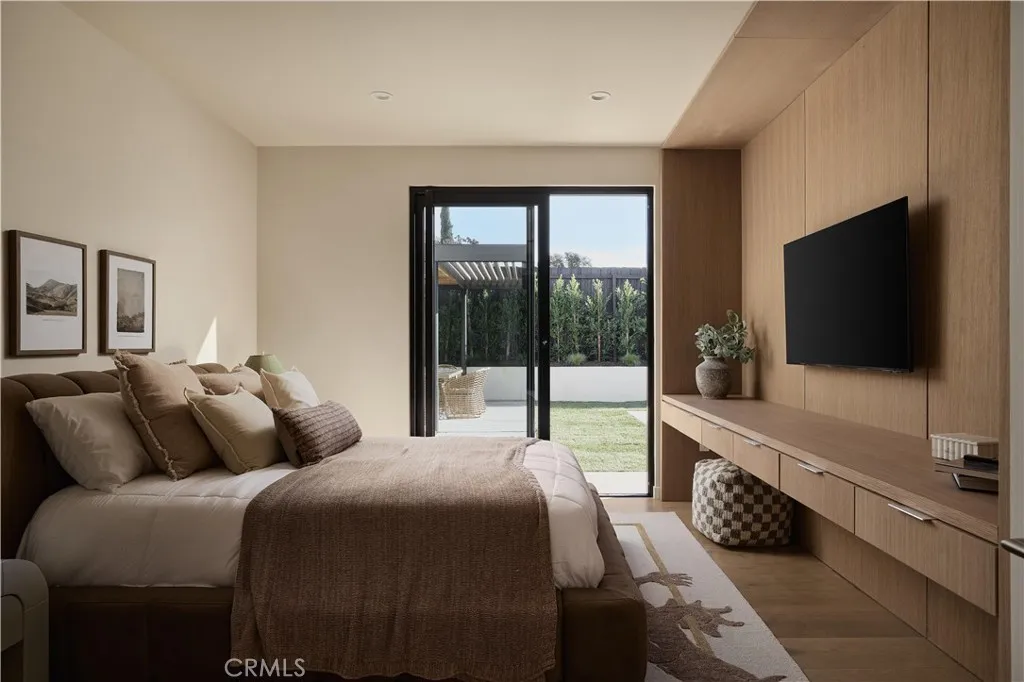 An iconic Charles Du Bois mid-century home, thoughtfully and completely reimagined by Wyota Workshop, blending timeless architectural integrity with modern volume, warmth, and livability. This 4-bedroom, 3.5-bath residence honors the original spirit of Du Bois design while elevating it for contemporary living. The homes layout has been reworked to introduce a dramatic 36-foot-long living room with 12-foot ceilings, creating an expansive sense of scale and light rarely found in homes of this era. A cantilevered ceiling extends seamlessly toward the outdoor patio, reinforcing true indoor-outdoor living and allowing the interior spaces to flow effortlessly into the landscape. Throughout the home, custom oak cabinetry has been meticulously designed and built in every space, offering warmth, cohesion, and exceptional storage without compromising clean architectural lines. The dining room is anchored by a refined wet bar with wine refrigeration, making it ideal for entertaining. The kitchen is both sculptural and functional, featuring Thermador appliances, natural Taj Mahal quartz countertops, and a striking waterfall island that serves as the heart of the home. The residence offers dual primary suites, thoughtfully positioned on opposite sides of the home to provide privacy and flexibility perfect for guests, in-laws, or work-from-home needs. Outside, the property continues to impress with a modern linear pool and spa, a covered outdoor BBQ area, and multiple zones designed for relaxation and entertaining. A poured-in-place concrete firepit with custom bench seating anchors the