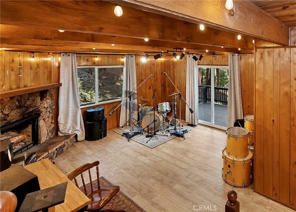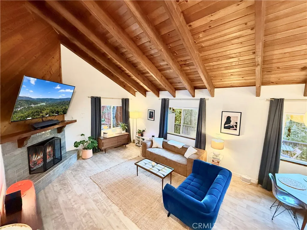 Welcome home! This 3 bedroom 2 bath home boasts beautiful views of the forest. Upon entering the home, you are greeted with a large open floor plan perfect for entertaining and enjoying the vast views from the comfort of the updated fireplace or outside on the deck. On the main level you have two bedrooms and a full bathroom. The main living room has large vaulted ceilings that flows into the kitchen area, giving you endless possibilities for entertaining or simply enjoying the serenity of the forest views. The home has updated double paned windows/sliding doors and a newer 40 year roof installed in 2016. Continue down the stairs to the primary bedroom and another living area complete with a second fireplace and deck. There is a bonus room which could be used as a 4th bedroom as well. The property line goes up to the road on Crest Forest Drive and has the space for a future parking deck. Very close to Lake Gregory and shopping in downtown Crestline.