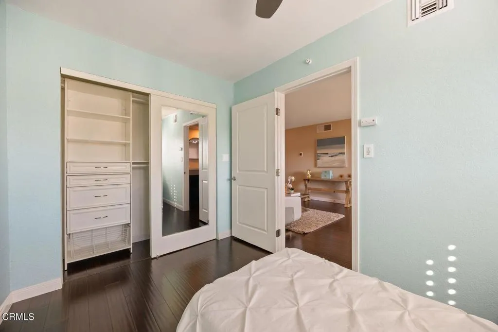 Welcome home to this 1-story top floor end unit that has been impeccably upgraded with luxurious finishes, bamboo hardwood floors and serene views from your private balcony. Walk through the freshly painted door into your spacious open floor plan that is warmed by a cozy fireplace and accented with custom lighting, gleaming hardwood floors, sliding doors & plantation shutters.Perfect for the aspiring chef, gourmet kitchen features ample quartz counter space, stainless steel appliances, custom cabinetry and subway backsplash. Cook for family & friends as they relax on the thoughtfully designed built-in banquet seating.Head to the oversized Master Bedroom with a walk-in closet, Executive Office, recessed lighting and voluminous ceilings. The fully upgraded bathroom is gorgeous! Featuring quartz countertops, bath, pocket privacy door for the toilet and custom cabinetry. Ample storage closets, allowing space to add on to this already turn-key unit.The second bedroom is privately positioned across the family room, with mirrored closet, built-ins, ceiling fan and plantation shutters. Newer flooring, recessed lighting, plantation shutters, Nest Central A/C, Views of the pool are just some of the charms this home offers.This peaceful community has a lovely courtyard with a BBQ area and nicely maintained landscaping throughout, sparkling pool, billiard room, ping pong, banquet room, on-site laundry facilities, gym and underground parking! **HOA pays Water + Trash + Gas + the amazing amenities** Located in a desirable gated community, you will be close to public transportation, PCC,