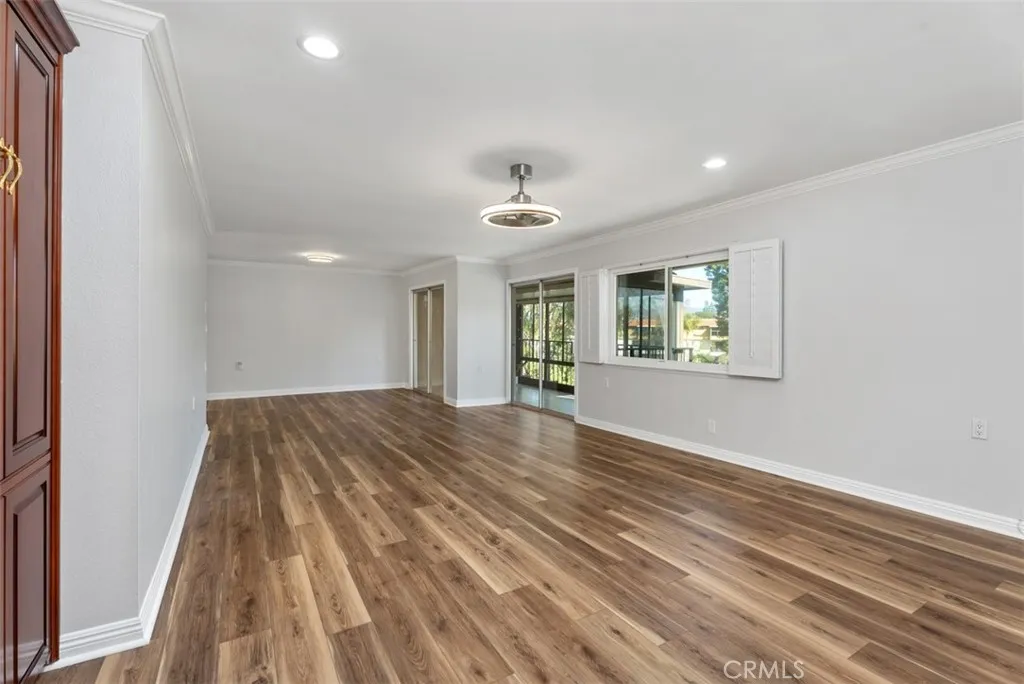 This charming top-floor one-bedroom Garden Villa is ideally located adjacent to the golf course, just moments from the fairways, offering the perfect blend of space, comfort, and resort-style living. The home features a very spacious living and dining area and a well-designed galley kitchen. The living room is so generously sized that it easily accommodates a built-in desk and a Murphy bed, making it wonderfully versatile. Both the living room and bedroom are equipped with mini-split-system A/C units, along with smooth ceilings, elegant crown molding, recessed lighting, and new low-profile ceiling fans. The kitchen's granite countertops, high-end stainless steel finish appliances, and recessed lighting add a touch of sophistication. The glass-enclosed, large balcony provides an additional living space (not counted in assessor square footage) to relax and enjoy coastal breezes and tranquil views of the lush, park-like setting. The bathroom features a newer walk-in jetted tubperfect for relaxing and unwinding after an active day enjoying all the fun activities Laguna Woods has to offer. The subterranean garage parking space is conveniently located near the elevator, providing easy access to the third floor. There is extra storage and a shared electrical outlet convenient to the parking spot for golf cart charging. A short golf cart ride or easy stroll takes you to Clubhouse 4, home to exceptional arts and crafts facilitiesincluding a carpentry shop, photography studio, sewing center, lapidary, ceramics studioas well as a large pool, spa and changing area. Ownership includes a