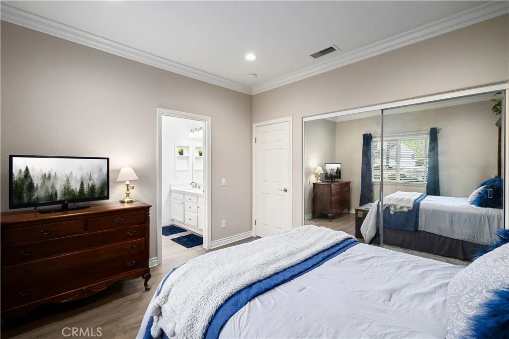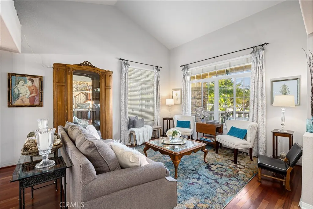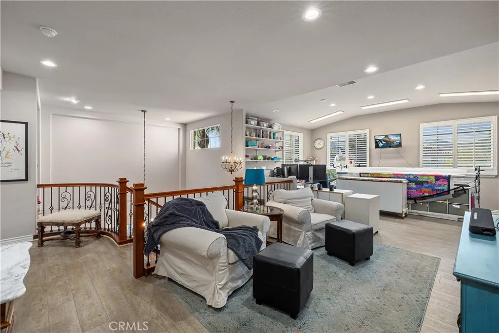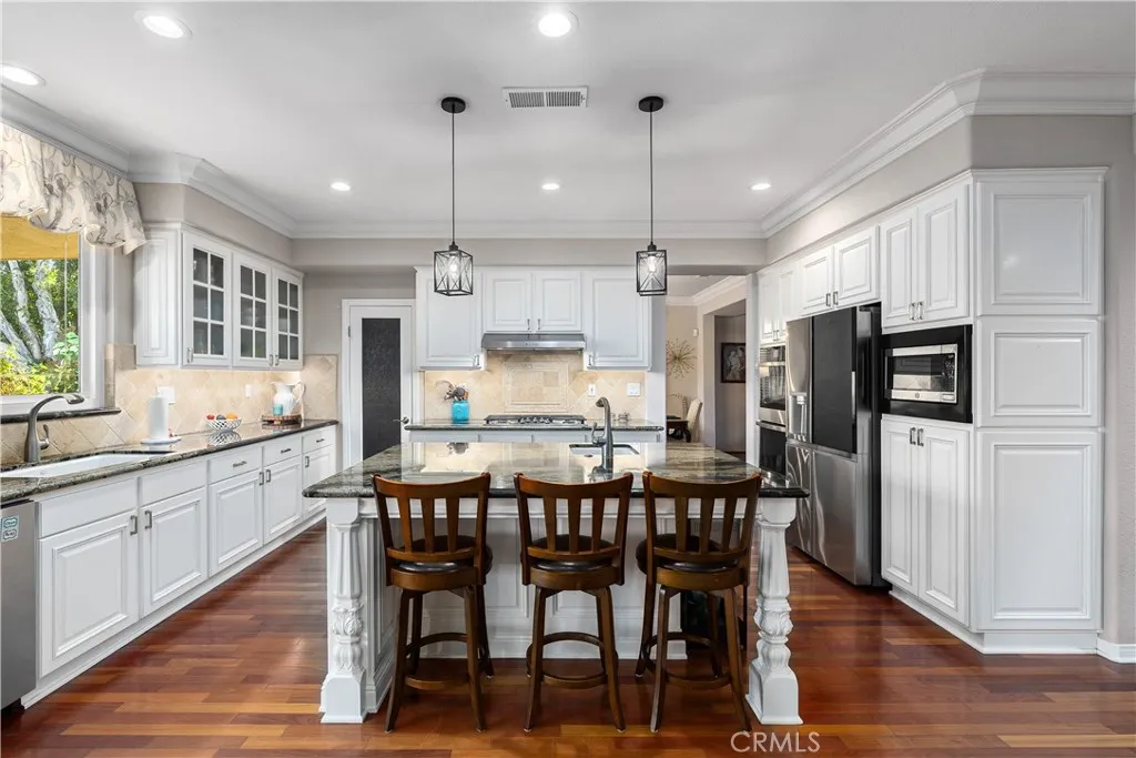 Positioned at the end of a cul-de-sac within the gated La Verne Heights community, this expansive residence blends architectural scale, refined detailing, and resort-inspired outdoor living. A four-car garage, dedicated RV parking, and approx. ten additional uncovered parking spaces provide exceptional flexibility. An artificial turf front lawn and a walkway lead through manicured landscaping with a fountain, and to a private front courtyard. The covered entry is framed by stone columns and double wood doors with iron and glass inlays. Inside, a two-story foyer showcases soaring ceilings, a chandelier, rich hardwood flooring, and a staircase with wood handrails and iron balusters. The formal living room features vaulted ceilings and a large window overlooking the front yard. The adjacent dining room offers crown molding, French doors to the backyard, and direct access to the kitchen. The remodeled kitchen is appointed with classic white cabinetry, granite countertops with full tile backsplash, stainless steel appliances, a center island with pendant lighting and seating, a walk-in pantry, a breakfast nook and a corner butlers pantry. The family room includes LED lighting, crown molding, an elevated fireplace with custom carpentry detail, plantation shutters, and French doors providing backyard access. A downstairs bedroom, currently used as an office with double doors, offers direct access to the guest bathroom. The laundry room features cabinetry, a folding counter, utility sink, and garage access. Upstairs, a large bonus room offers vaulted ceilings, LVP flooring, and mou