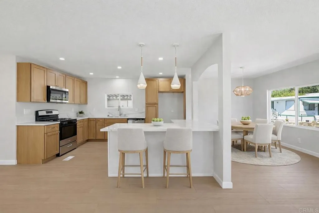 Welcome to your beautifully remodeled Alpine retreat, where modern upgrades meet the charm of a peaceful, community-driven lifestyle. This stunning 2-bedroom, 2-bath home offers approximately 1,224 square feet of light-filled living space with a bright, open floorplan that feels both spacious and inviting. The fully remodeled kitchen serves as the heart of the home, featuring sleek quartz countertops, stainless steel appliances, warm wood cabinetry, and an oversized island that seamlessly connects to the living and dining areas. Perfect for everyday living and entertaining. Expansive windows bring in abundant natural light, highlighting the wide-plank flooring, fresh finishes, and clean, contemporary design throughout. Both bedrooms are generously sized, with the primary suite offering a peaceful retreat, while updated bathrooms, recessed lighting, dual-pane windows, and a newer HVAC and A/C system provide comfort and efficiency. Nestled in the heart of Alpine, this home offers the perfect balance of quiet, scenic surroundings and close proximity to local favorites, charming cafs, boutique shopping, and easy freeway access. Known for its small-town feel, beautiful landscapes, and strong sense of community, Alpine is a place where you can truly unwind while staying connected. With low space rent and a turnkey interior, this home is move-in ready and an incredible opportunity to enjoy one of East Countys most desirable lifestyles.