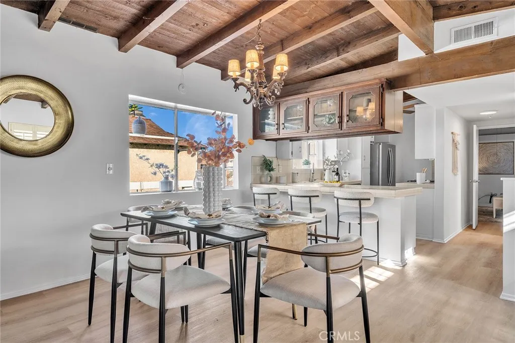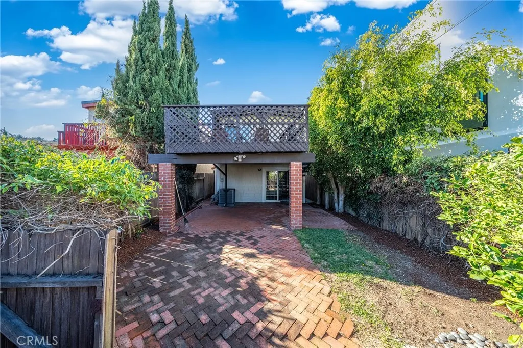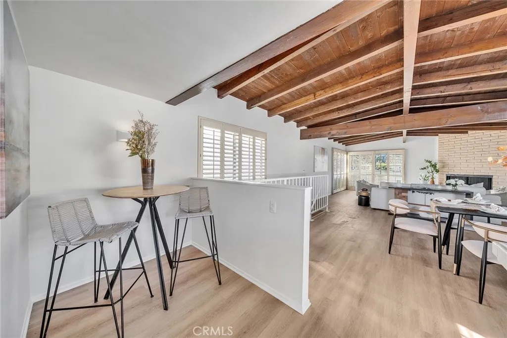 Welcome to this beautifully designed Walteria home tucked along a tree-lined street at the base of the Palos Verdes foothills where comfort, space, and indoor-outdoor living come together for the perfect Southern California lifestyle. With over 1,700 square feet of living space, this inviting two-story home offers a thoughtful layout ideal for everyday living and entertaining. The entry level features two spacious bedrooms, a full bath with quartz counters, convenient laundry, and a versatile bonus/storage room perfect for hobbies, organization, or future customization. Upstairs, the home opens into a light-filled living space highlighted by dramatic wood beam ceilings, a cozy fireplace, plantation shutters, and a balcony overlooking the charming neighborhood. The adjacent dining area easily accommodates large gatherings, while the kitchen connects to a flexible nook that can serve as an office, play area, or creative workspace. The primary suite feels like a private retreat, featuring matching beamed ceilings and direct access to an expansive deck an ideal setting for morning coffee, sunset dinners, or simply unwinding outdoors. A dual-access bathroom connects both the primary bedroom and living space for added functionality. Step outside and discover a backyard sanctuary filled with greenery, shaded lounging areas, and sunny open spaces. Stairs lead from the deck down to the yard, creating seamless indoor-outdoor flow perfect for entertaining or relaxing in your own private escape. Additional highlights include a direct-access two-car garage with driveway parking and lo