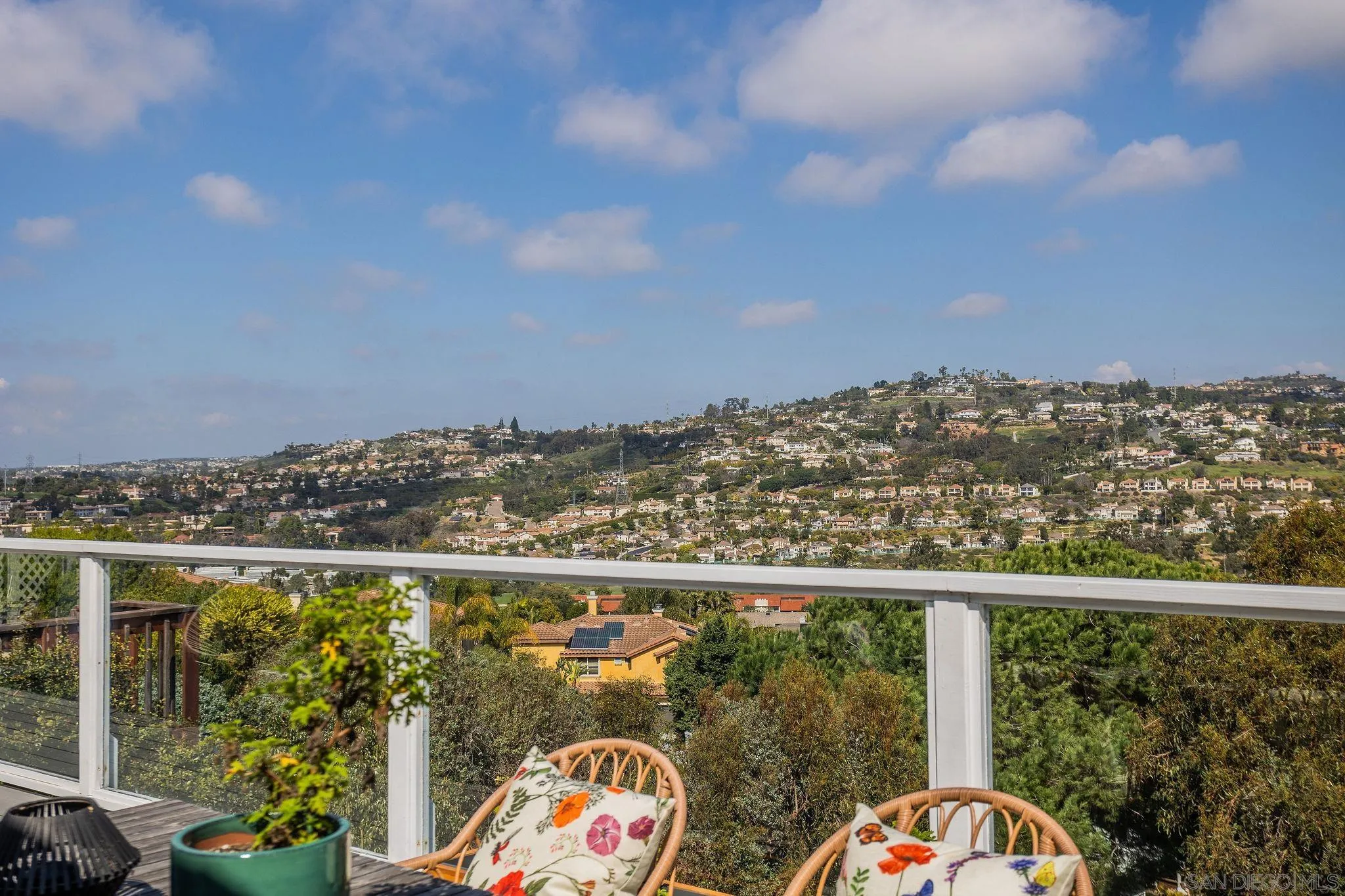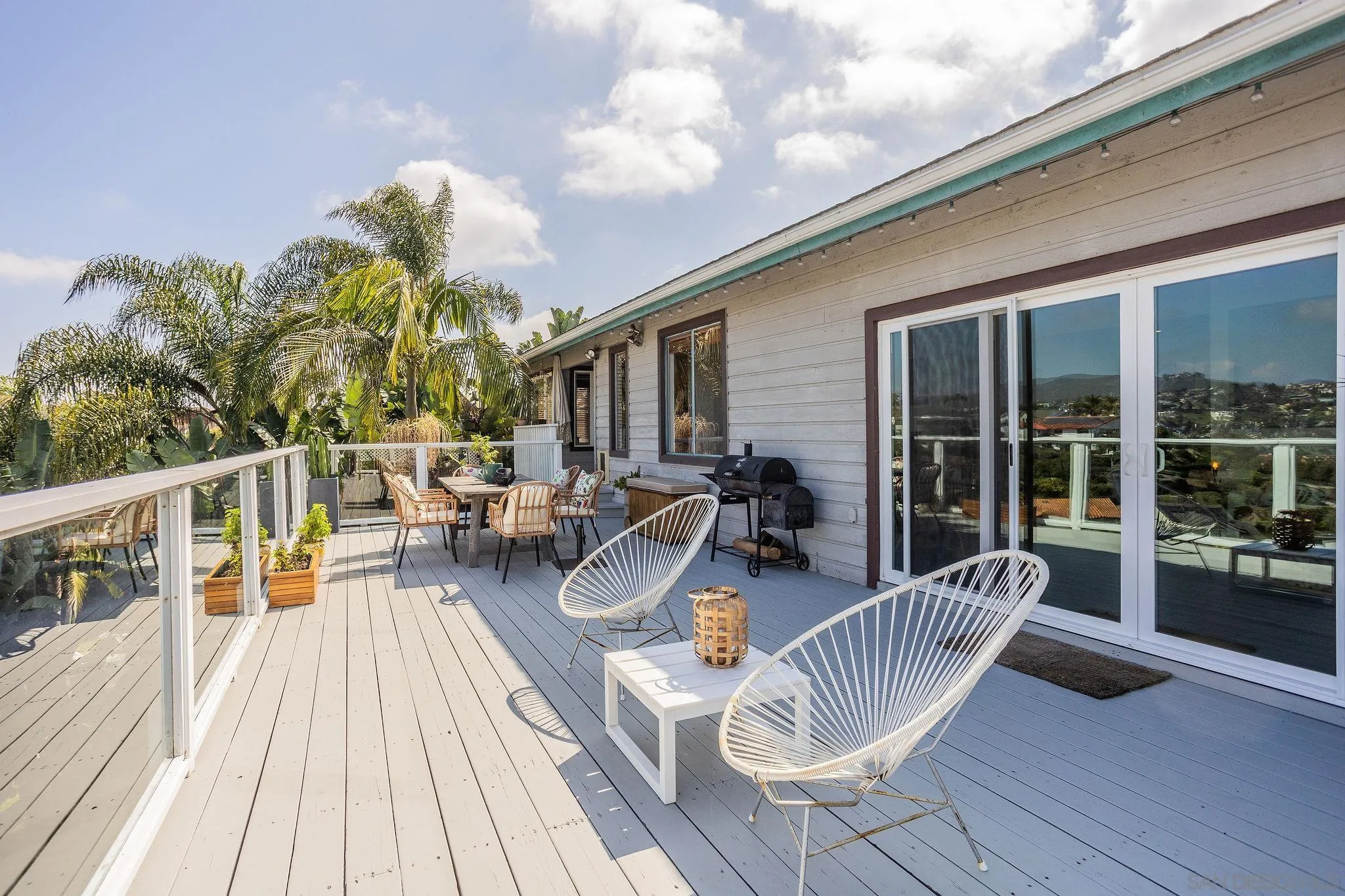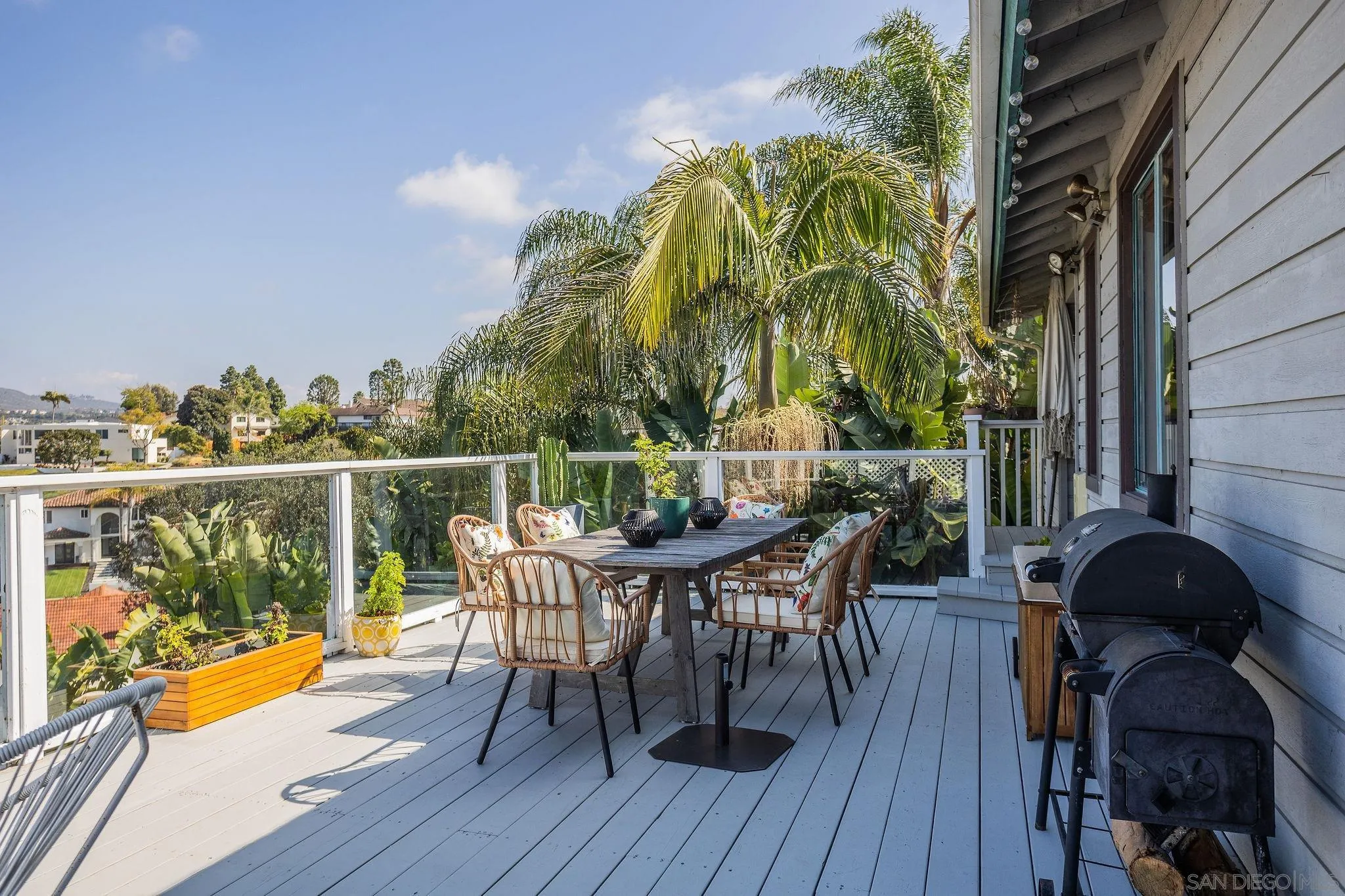 Stunning single-level home partially remodeled in 2019! located within the heart of Carlsbad. Situated on a .39-acre lot with gorgeous VIEWS and ADU potential! One bedroom and bath could be completely secluded with its own entrance. Incredible view of the Carlsbad hills visible from the master bedroom, living room, dining room, kitchen and office. This amazing residence features a large and bright office, and engineered hardwood flooring throughout. Vaulted ceilings with large windows and French doors in the dining room, living room, and primary bedroom bask the home in an abundance of natural light. A beautifully appointed Chef’s kitchen boasts quartz countertops, sleek stainless-steel appliances, recessed lighting, and modern cabinetry with breakfast counter seating that opens to the living area. A spacious primary suite offering deck access, a walk-in closet with a nice wood finish, and its own spa-like en-suite bath featuring dual sinks and a custom walk-in shower. Outdoor living has been extended to the Entertainer’s backyard featuring a sprawling deck with four levels of sundecks, lush landscaping and thoughtfully-designed hardscape including peaceful and serene seating areas, perfect for entertaining and taking in the views. The lower portion of the yard offers a large level grassy area with several varieties of fruit trees, plants, and herbs including Avocado, Pomegranate, Lemon, Apples, Cherry, Apricot, Dragon Fruit, Passion Fruit, Raspberry, Strawberries, Rosemary and Thyme.