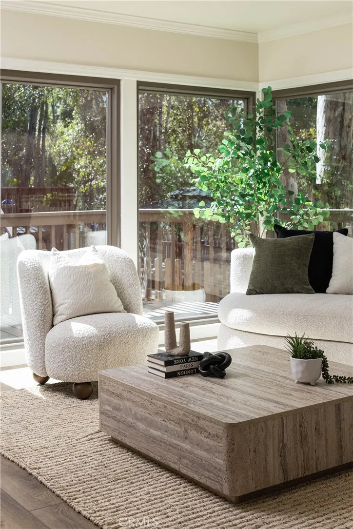 Set beneath a canopy of soaring eucalyptus trees, this beautifully renovated home offers tranquility the moment you arrive. Located in The Woods, one of South Orange Countys most distinctive enclaves, shaded streets and oversized lots create a setting that feels transportive, yet you remain just moments from it all. Completed with a long-term lens, the 2025 renovation blends elevated turnkey design with meaningful infrastructure improvements, while preserving the warmth and architectural character that make The Woods so visually distinct. Enter to airy vaulted ceilings and a smooth, open flow throughout the main living spaces. The redesigned gas fireplace serves as a striking focal point, featuring new finishes and remote control functionality for tailored warmth and ambiance. The living room connects to the dining nook and functionally designed kitchen with all new appliances, while an additional dining area and adjoining family room offer flexibility. A full wall of windows brings in natural light through the surrounding trees, creating a true indoor-outdoor feel. Extra-thick luxury vinyl plank flooring, fresh paint, recessed lighting, updated fixtures, fully renovated bathrooms, and all new custom solid core doors elevate the interiors. Newly insulated walls and ceilings, along with energy-efficient, noise-reducing windows and sliding glass doors, enhance comfort and quiet throughout. Upstairs, the remodeled primary suite offers serene treetop views from a private balcony, joined by three additional bedrooms and an updated secondary bath. Outside, an expansive deck with