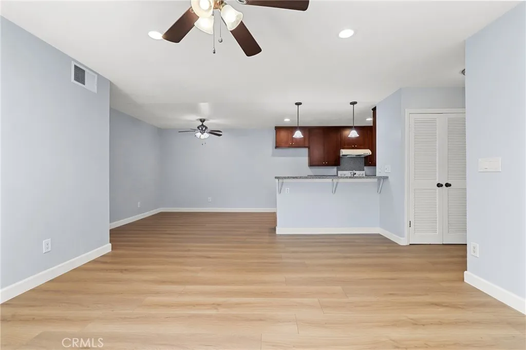 Welcome to this immaculate upper-level condo in the desirable Woodside Village neighborhood of Santa Ana. Thoughtfully updated and move-in ready, this light-filled home features wide plank luxury vinyl flooring throughout, fresh interior paint, and recessed lighting that enhances the modern, airy feel. The inviting living room opens to a private balconyperfect for morning coffee or relaxing evenings. The well-designed floor plan offers comfortable living with a seamless flow between the living, dining, and kitchen areas, ideal for both everyday living and entertaining. Bathroom with upgraded, remodeled shower. Located within a gated community, Woodside Village offers resort-style amenities including sparkling pools, a clubhouse, and beautifully maintained lush green spaces, creating a peaceful and welcoming environment. Conveniently situated near shopping, dining, and major freeways, this home combines comfort, style, and accessibility in one exceptional opportunity.