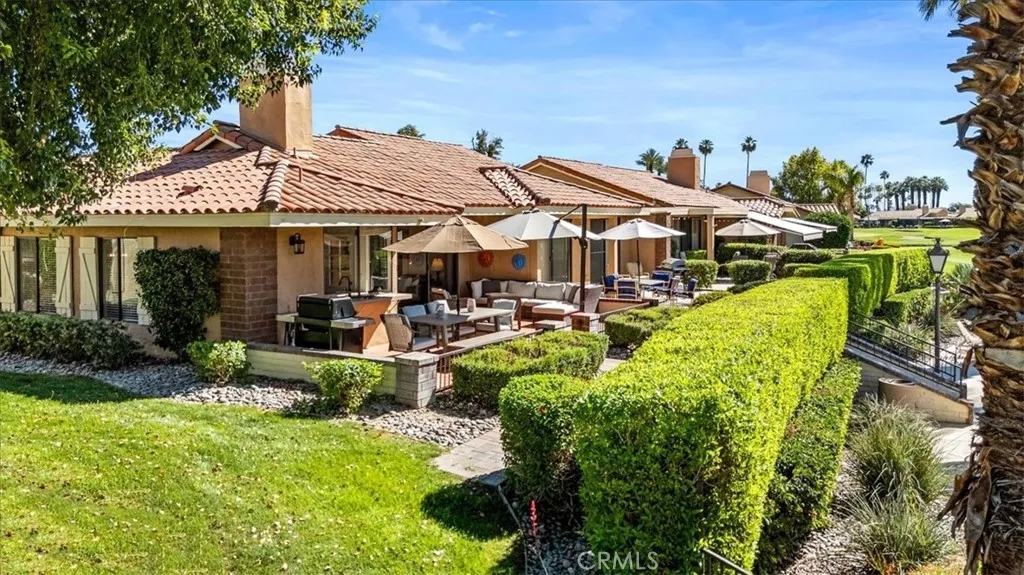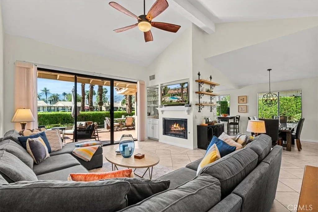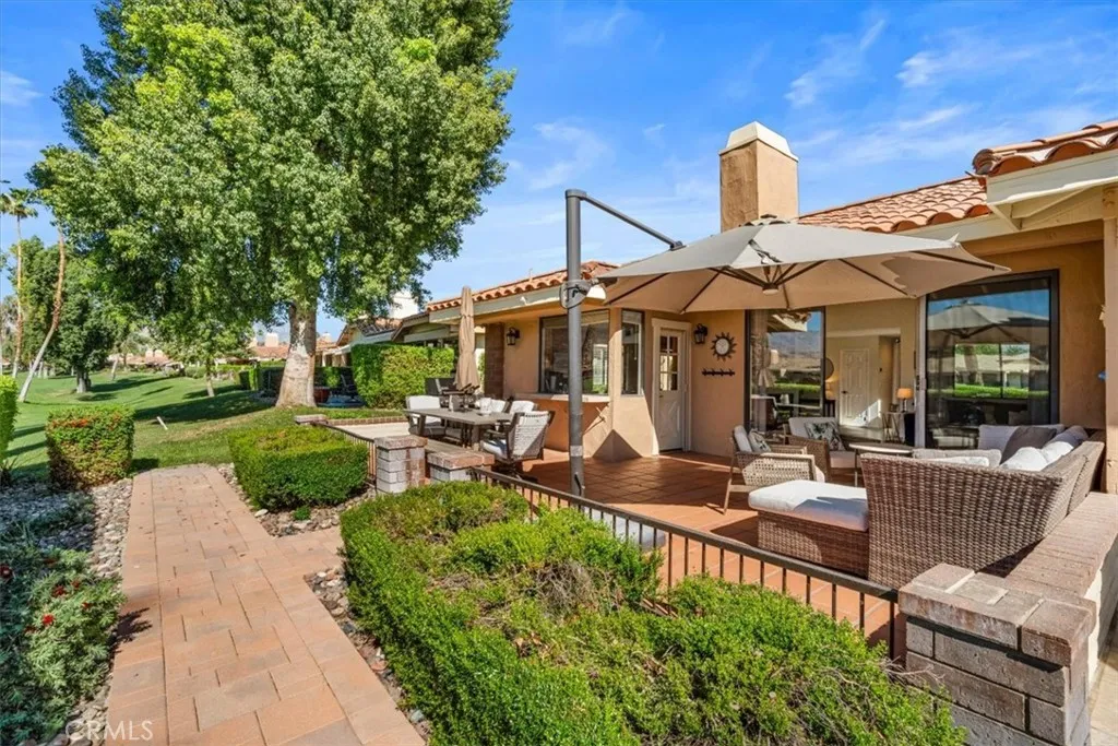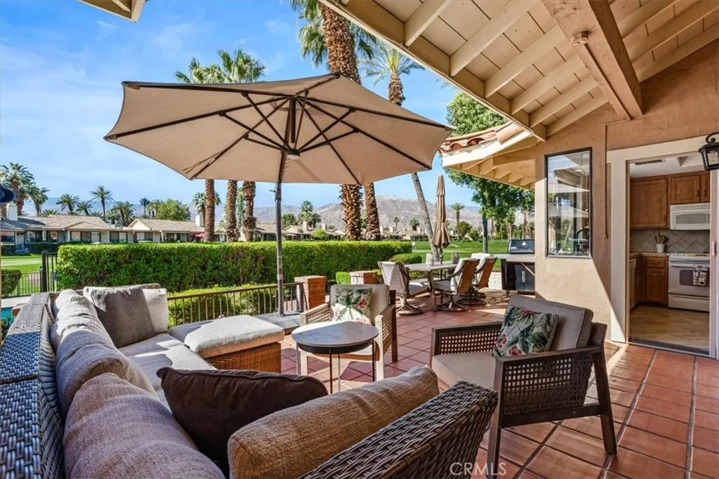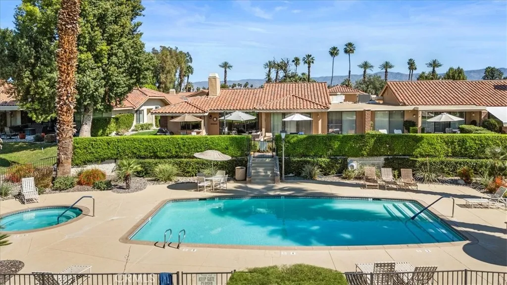 This one checks ALL the boxes! Do you like gorgeous views? CHECK. Do you like a backyard-like pool that you don't have to maintain? CHECK. Do you like having a beautiful vacation home that doubles as a great investment with short term rental potential? CHECK. This is it and it's in Monterey Country Club, one of the most sought after locations in the Palm Springs valley, and one of the few that still allows short term rentals. This well maintained, updated END unit has 2 bedrooms and a flex space currently staged as a third bedroom. Bright, clean and airy with a stylish Boho chic aesthetic, you will never want to leave. AC, fridge, washer and dryer only a couple of years old. This unit has the envied, stunning southern views of the Santa Rosas, meaning you get great light all day but not a direct hit from the sun--a major perk here in the Desert. Monterey CC has 37 pools and spas and your new home backs RIGHT up to one of them. It also boasts a vibrant clubhouse, 27 holes of a Ted Robinson designed course, Pickleball, Tennis and Bocce. Monterey CC is in the epicenter of the valley right between Palm Springs and La Quinta, as well as famous El Paseo offering fine dining and shopping and Disney's Cotino downtown area soon to be opening. The McCallum Theatre is walking distance and Acrisure Arena and Palm Springs International are only a short drive. Lucky you!!!