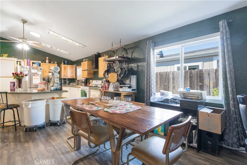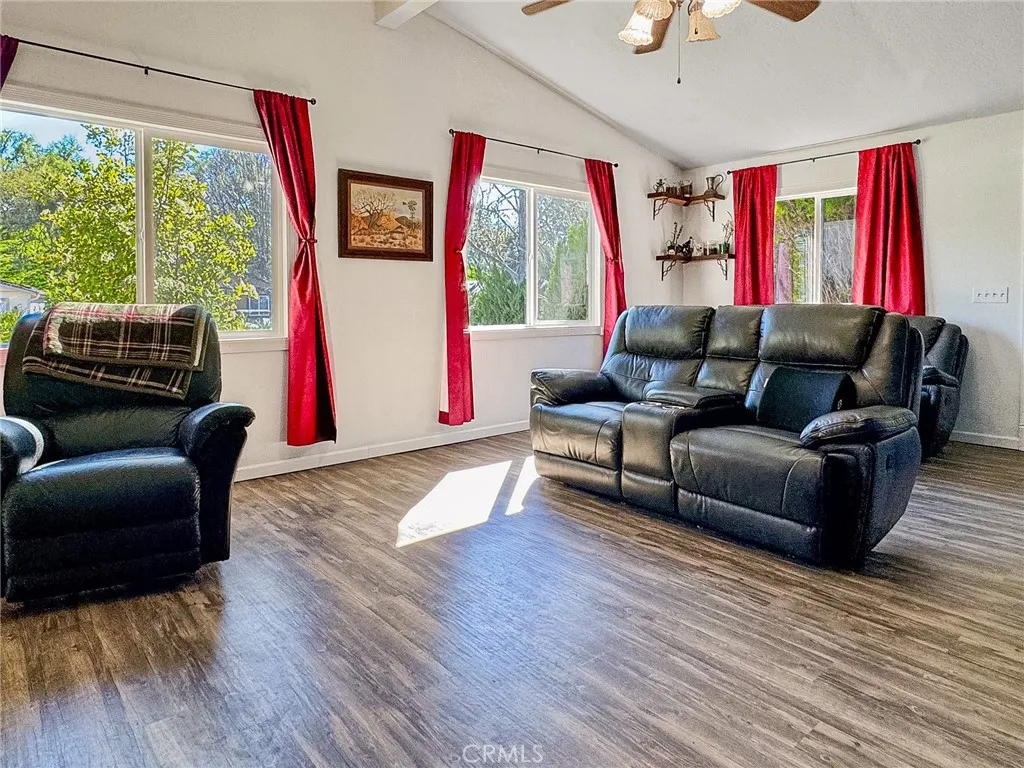 Welcome to 2599 Bridle Trail your Heritage Ranch retreat near Lake Nacimiento. This beautifully maintained 1,344 sq ft home offers comfort, privacy, and thoughtful upgrades in one of the areas most desirable lake communities. Luxury vinyl flooring runs through the main living areas with plush carpet in the bedrooms. Both bedrooms feature their own en suite bathrooms with tile flooring, newer vanities, and updated lighting. Decorative door and window trim adds character throughout the home. The spacious kitchen includes updated upper cabinets and a large center island perfect for gathering and entertaining. The inviting living room features a charming shiplap accent wall that adds warmth and style. A brand new roof with a solar attic fan has just been installed, providing long-term value and improved energy efficiency. The upgraded HVAC system includes a UVC light and air scrubber to enhance indoor air quality. Dual-paned Pella windows in the living and dining rooms help maintain comfort year-round, while a pellet stove in the dining area adds cozy charm. The garage features a newer door with backup battery opener, and solar power is provided through a leased Tesla system. The backyard backs to open space for added privacy and features two covered patios with a private hot tub tucked beneath one patio. The side yard features a large covered storage area to keep your additional property protected from the elements. The attached garage also includes a hobby-room-sized man cave with its own swamp cooler, ideal for projects or hobbies. Located in the gated community of Heritage