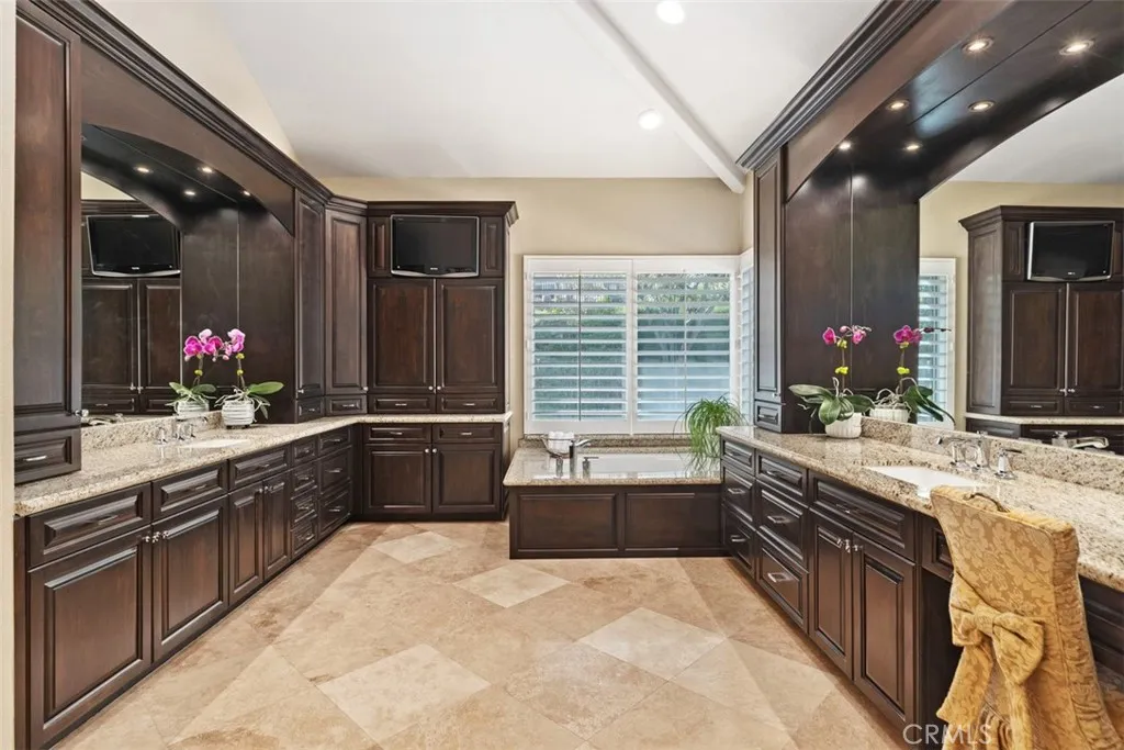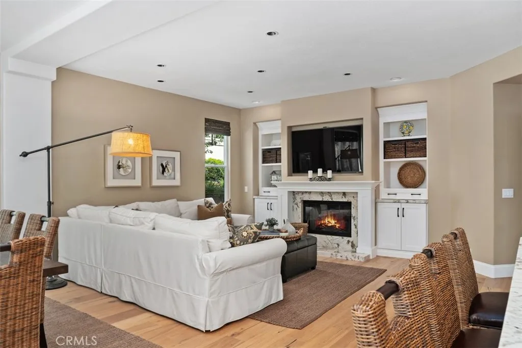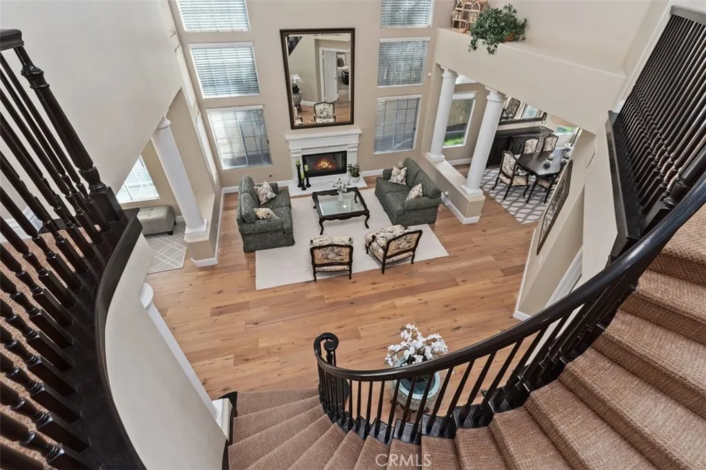 Welcome to this beautifully upgraded home in the highly sought-after Califia neighborhood of Mission Viejo. Ideally located on a quiet single-loaded view street, this impressive 5-bedroom residence blends timeless elegance with modern upgrades and thoughtful design. Step through the entry into a dramatic foyer with soaring cathedral ceilings and an abundance of natural light. Spacious living areas are highlighted by numerous windows and quality upgrades throughout, including Provenza engineered hardwood flooring, upgraded baseboards, and crown molding. The formal dining room is perfect for entertaining and features French doors that open to the patio and lush backyard, creating seamless indoor-outdoor living and an ideal setting for al fresco dining. The updated kitchen is the heart of the home, showcasing a large center island with granite countertops, upgraded cabinetry, recessed lighting, and stainless steel appliances including a Thermador 6-burner cooktop and double ovens. The kitchen flows effortlessly into the family room, complete with custom cabinetry, recessed lighting, and plenty of space for gatherings. The main level also offers a versatile bedroom and ensuite full bathroom, ideal for guests or multi-generational living, in addition to a powder room adjacent to the large living room. Upstairs, the spacious primary suite features a cozy fireplace and bonus sitting area that can be used as a retreat, office, or reading space. The beautifully updated primary bathroom includes travertine flooring, upgraded cabinetry, granite countertops, a soaking tub, separate wal