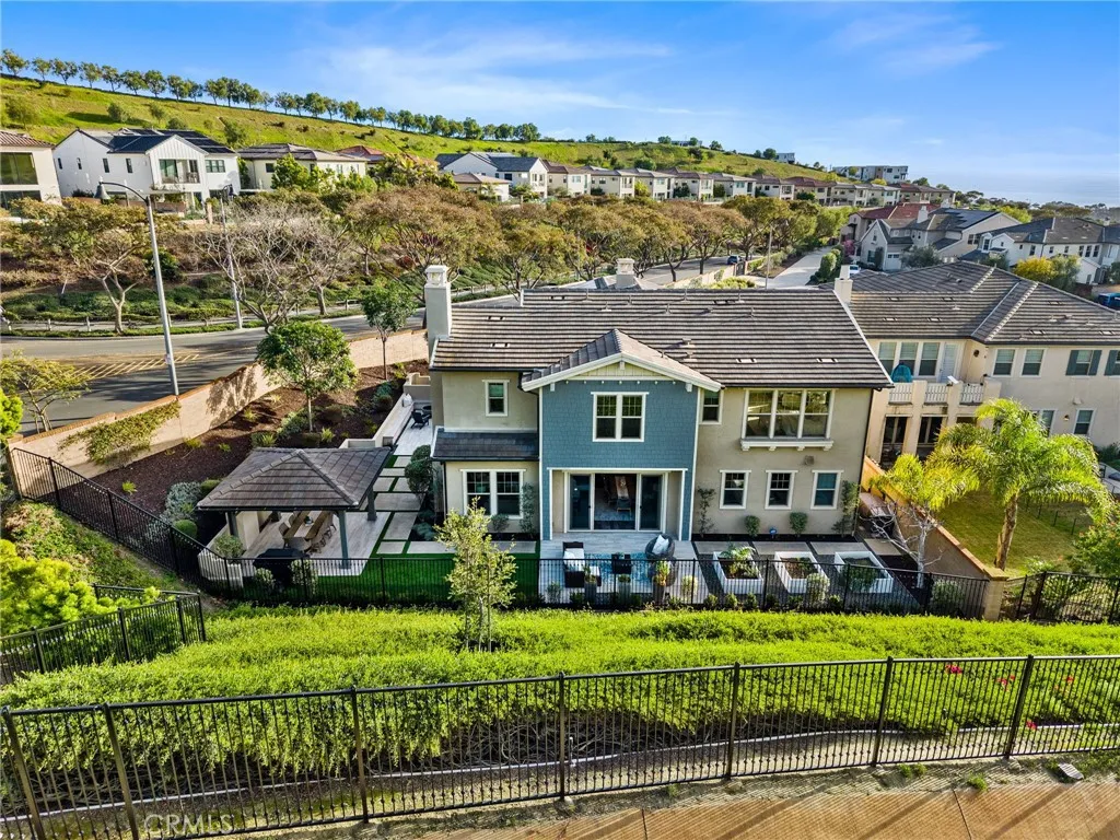 Presenting an exceptionally private homesite, this ocean-close executive-class residence is ideal for active families seeking a coastal lifestyle in the exclusive gated neighborhood of Blue Harbor at Pacifica San Juan. A top-of-the-cul-de-sac location with only one direct neighbor is the finest in the enclave and accommodates multi-driver households with an extended driveway. Just three miles from Dana Point Harbor, the newer Craftsman-style design was crafted in 2017 and welcomes guests with a front yard patio, and an entry courtyard with romantic stone portico with open-air fireplace, built-in seating and upgraded tile decking. Grounds extend nearly 17,649 square feet and include a backyard with entertainment pavilion and private patio. Solar power complements the two-story residence, which reveals five ensuite bedrooms and five- and one-half baths in approximately 4,053 square feet. One bedroom is located on the main floor, and a casita with separate entrance makes a great office or guest suite. First impressions are stunning, with a double-height ceiling and dramatic staircase embellishing the foyer. To the left, a formal living room with fireplace opens to the courtyard. On the right, free-flowing living spaces include a fireplace-warmed family room with paneled accent wall and surround sound, and an open dining room with backyard access. The kitchen showcases slate Shaker cabinetry with fashionable brass hardware, white Shaker cabinetry at a generous island, a full backsplash to the ceiling, walk-in pantry, and high-end stainless steel appliances including a built-in