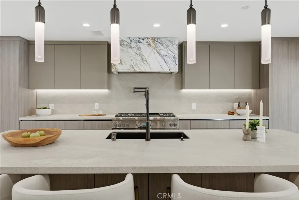 Perched in the coveted Hollywood Hills, this newly reimagined modern home is a striking expression of luxury, design, and harmony with nature. Thoughtfully crafted to elevate everyday living, the residence offers an exceptional indoor-outdoor lifestyle moments from the Sunset Strip and Los Angeles most celebrated dining and nightlife. Spanning six bedrooms and six and a half bathrooms, the home welcomes you with a dramatic open-concept floor plan defined by great spaces and impeccable finishes. The main level showcases oversized 60x60 Italian tile flooring and custom European flat-panel cabinetry throughout. The living room is anchored by a breathtaking Calacatta marble fireplace that flows seamlessly into the dining area and a custom-built wine room ideal for entertaining. The state-of-the-art chefs kitchen blends form and function with Italian porcelain slabs wrapping the oversized island, cabinetry, and backsplash, complemented by Graff fixtures and a Calacatta marble hood. Thermador appliances include a built-in refrigerator, precision coffee system, six-burner range with double oven, dishwasher, and micro-drawer microwave. Custom lighting enhances every detail. A curved staircase illuminated by lighting leads to the private living quarters. The expansive primary suite is a serene retreat, framed by oversized picture windows that invite the surrounding landscape indoors. Custom cabinetry, an oversized walk-in closet, and a spa-inspired bathroom complete the experience. The primary bath features dual vanities topped with Calacatta marble, premium fixtures, a freestanding