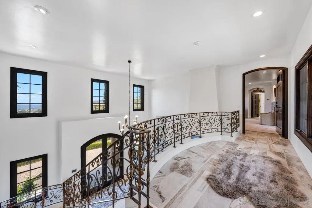 Welcome to this elegant, ivy-covered villa with grand architectural detail, enchanting gardens and panoramic ocean views. This palatial estate, perched in the rolling hills of La Jolla, is comprised of a luxurious main residence, attached guest house, a wellness pavilion, plus amenities that rival a 5-star resort. The property provides an unmatched experience of serenity and privacy, all just moments from the finest beaches and local attractions of La Jolla.As you pass through the stately gates, a meticulously paved driveway winds through immaculate gardens, leading to a grand stone fountain that signals the prestige of this remarkable property. The estate’s exterior is a study in timeless Mediterranean beauty, with terracotta roof tiles, wrought-iron balconies, and walls adorned with cascading ivy, creating a secluded haven that exudes charm and sophistication. Upon entering the main house, you are greeted by a magnificent foyer with soaring ceilings, an elegant fireplace, formal living room, and a sweeping staircase, setting the tone for the grandeur within. The gourmet kitchen is a chef’s dream, featuring exposed brick accents, vaulted ceilings with skylights, and a stunning oversized island. This space seamlessly flows into the intimate dining area, where seating for six is framed by custom windows that offer lush garden views. The adjacent family room invites relaxation, with a grand fireplace, plush sectional sofa, flatscreen TV, beverage storage refrigerator, and striking exposed beam ceilings that evoke a sense of rustic refinement. The primary suite is a true sanct