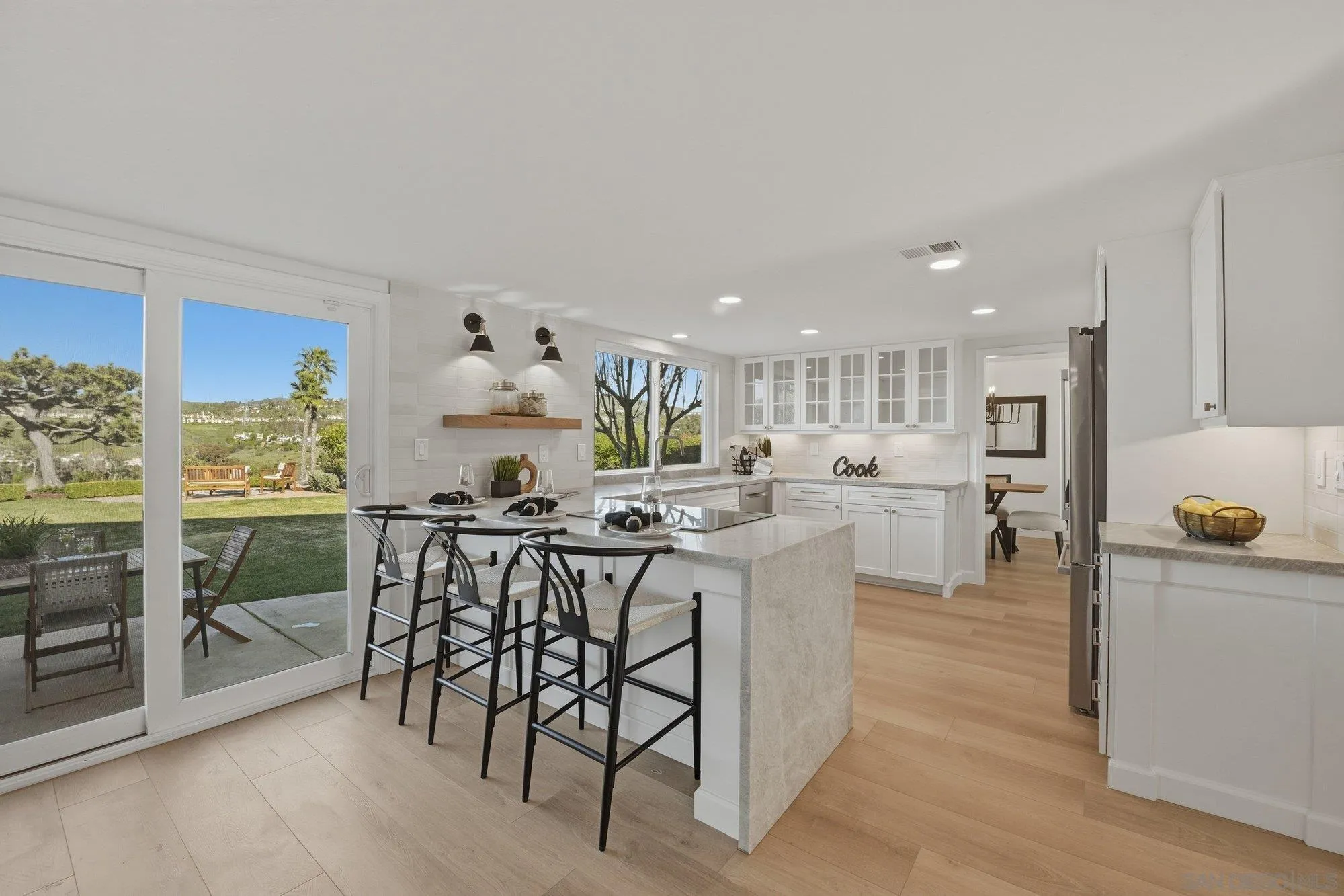 VIEWS VIEWS VIEWS! FULL HIGH-END RENOVATION just completed in 2026! Be the first to live in this stunning home since. Private, resort-like setting on a 0.24 acre lot in the heart of La Costa directly above the OMNI golf course. Nicely set back with a circular driveway and a fully enclosed entry courtyard that provides a real sense of privacy. Arched iron doors open into a well laid-out home where every inch has been professionally designed with high-grade finishes. Extra-wide plank floors lead your eye across the home, where the view can be seen from every room. The kitchen features Taj Mahal quartzite natural stone counters and Bosch appliances. The spacious living room has soaring ceilings, and a separate family room features a gorgeous herringbone fireplace. The downstairs bedroom can double as an office or den, and one of the three full bathrooms is also downstairs. The primary suite features a gigantic bathroom with a luxury shower and soaking tub, walk-in closet and a sliding door that leads to a balcony overlooking the entire La Costa Valley. Just 1 mile from the saltwater of the Batiquitos Lagoon and The Beacon La Costa, with high-end shopping, dining and Equinox Fitness Club at your fingertips. This home is simply one of the finest products to ever grace The Avenue. No HOA / No Mello-Roos. The location is ultra convenient. The schools are top notch. The landscaping is beautiful with several mature trees. This trophy property is an absolute show-stopper, turnkey ready for the new owner to step into the coastal La Costa lifestyle.