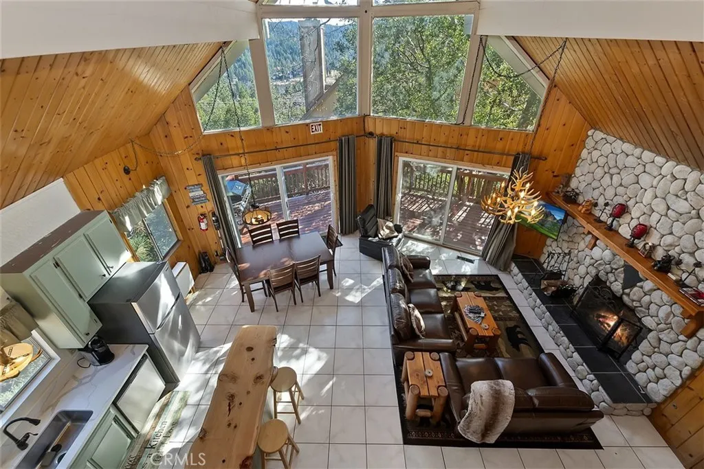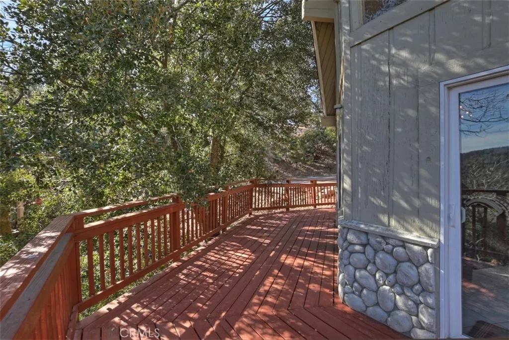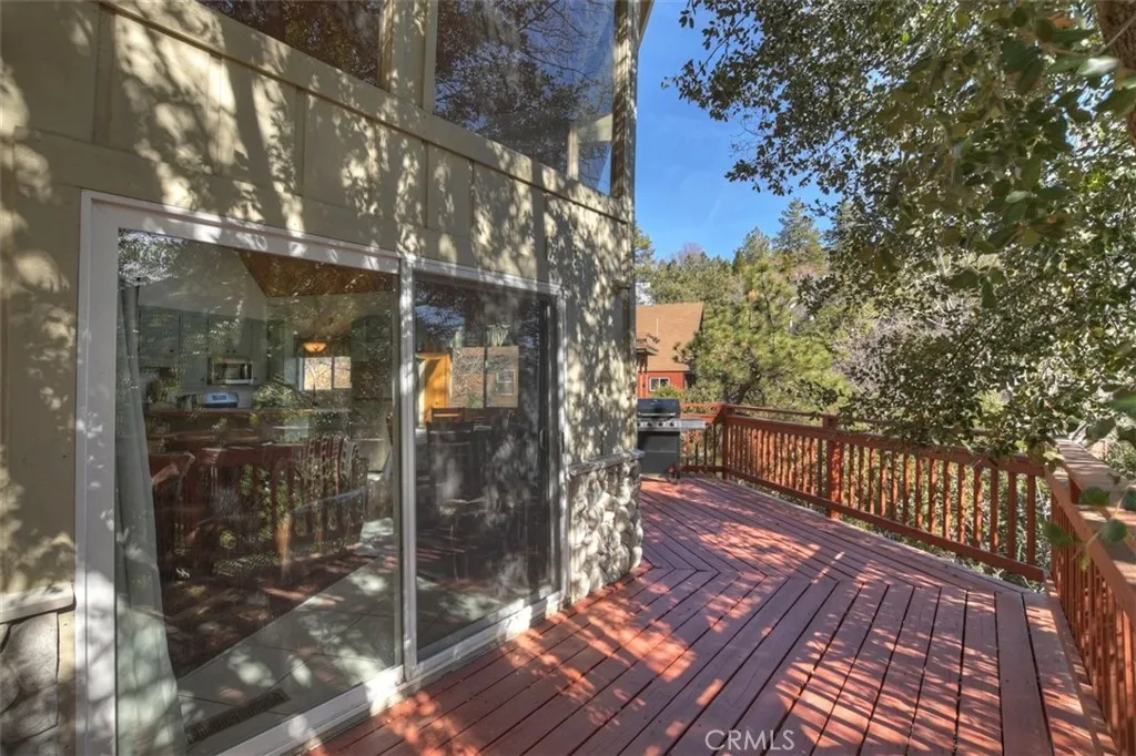 Classic Lake Arrowhead "Prow Front" cabin with "lake rights" to private Lake Arrowhead. Main floor living area is perfect for entertaining with an open floorplan featuring a wall of windows and slider out to wrap around deck overlooking Grass Valley Lake area and ridgeline views. Living room has a rock fireplace for those cool mountain evenings. Nicely updated kitchen with quartz counters, breakfast bar with a live edge wood slab counter top and stainless appliances with an adjacent dining area. Main level also has two good sized bedrooms and full bathroom. Upstairs you will find a huge loft set up as the primary bedroom with split A/C unit and private bathroom. Downstairs is a separate family room with another rock fireplace, pool table and slider out to another large deck. Also downstairs are two bunk rooms, laundry area and another bathroom. This could be a complete package with a multiple dock slip and boat available for additional $$.