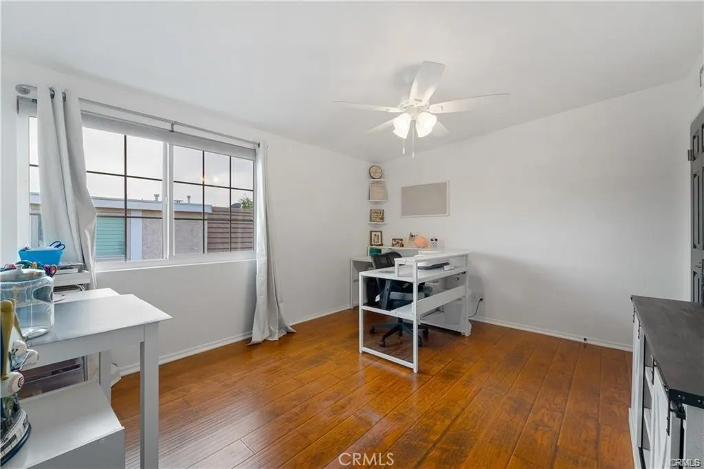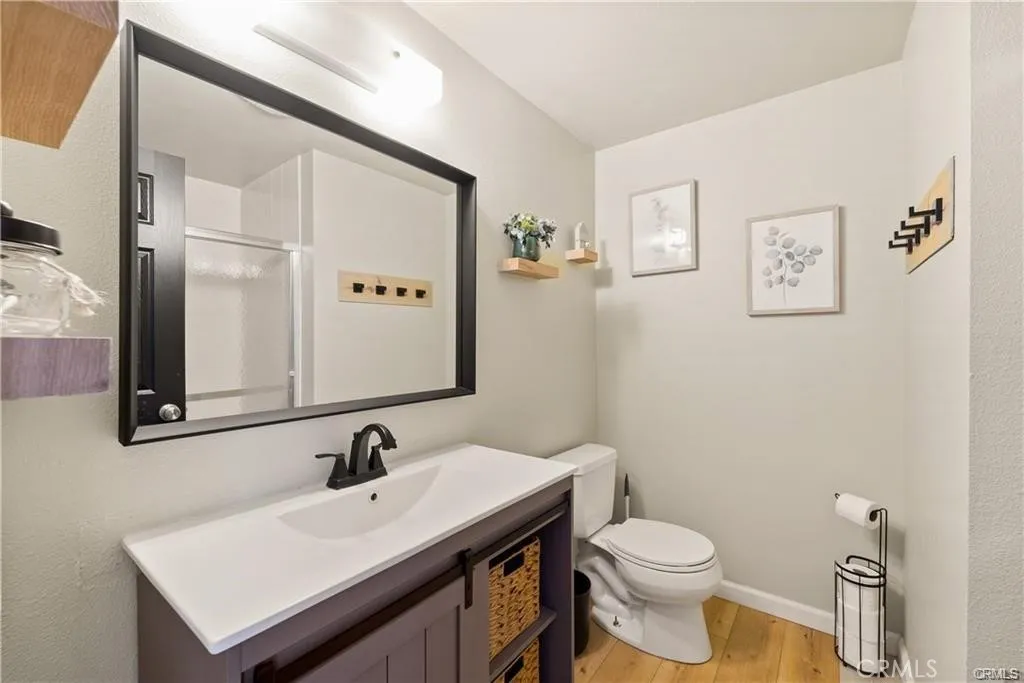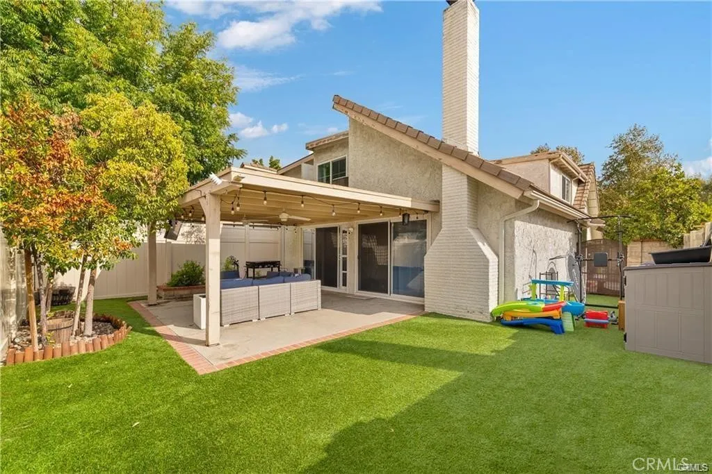 Situated in the desirable Valencia Racquet Club neighborhood, this tastefully updated home features 4-bed, 3-bath and just over 2,000 sf of refined living space. The inviting open floor plan offers a spacious living room highlighted by soaring vaulted ceilings and a cozy fireplace, formal dining room with a built-in bar, and beautifully remodeled kitchen equipped with stainless steel appliances and a breakfast counter. Step outside through dual sliding glass doors to a large covered patio, perfect for relaxing after a long day or hosting gatherings. The primary suite resides on the main level and boasts a renovated ensuite bathroom and ample closet space. Upstairs, you'll find three generously sized bedrooms and two full bathrooms. Other notable features include a gated front courtyard and two-car garage. Directly across the street is the gated community park, which features a sparkling pool/spa, clubhouse, tennis courts, a basketball court and playground. Additionally, you are conveniently located nearby excellent shopping and dining, top-rated schools and Central Park - a sprawling 130 acre park with a wide variety of recreational activities.